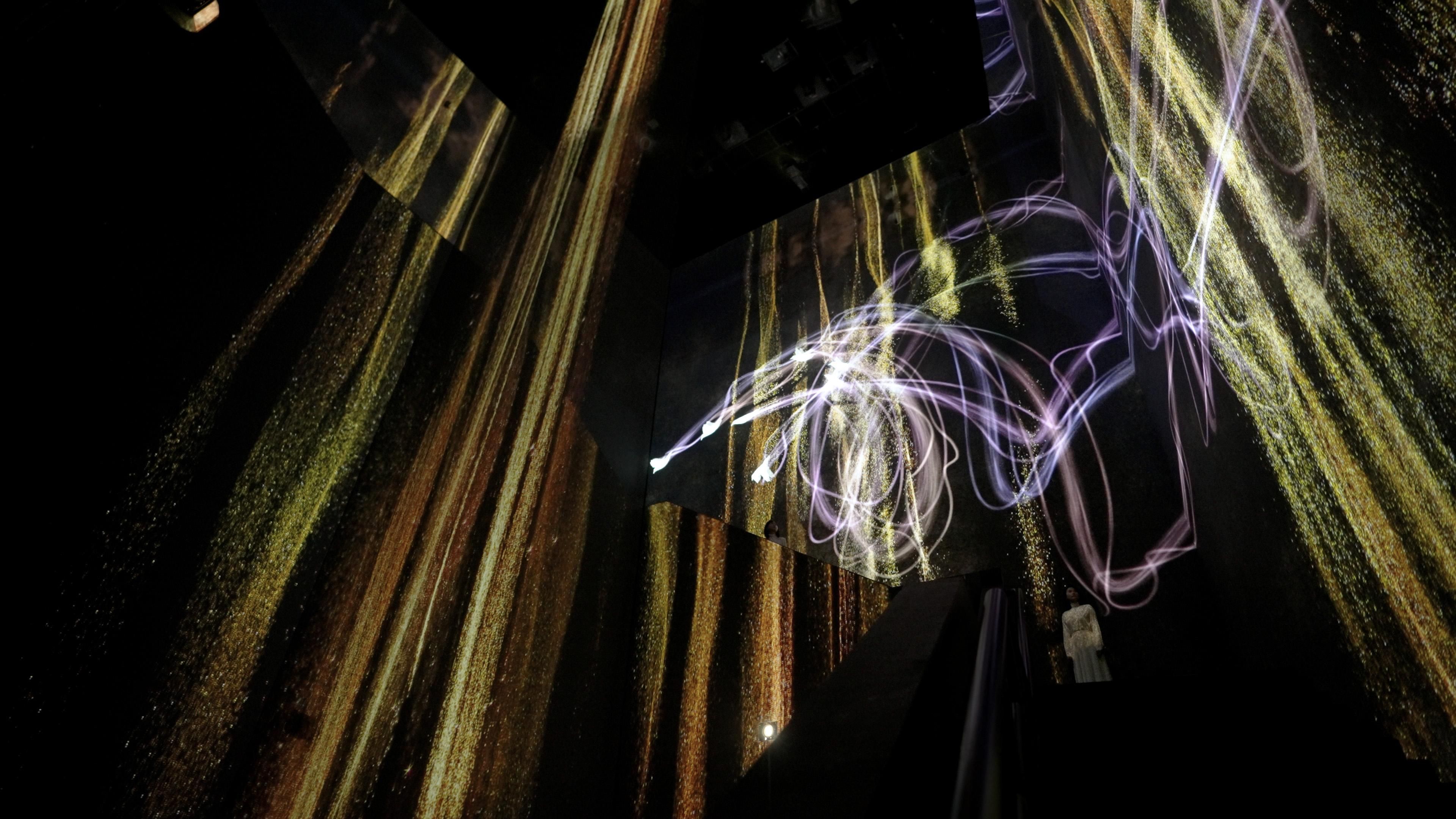 Crows are rendered in light as they fly around the space, leaving trails of light in their paths and creating spatial calligraphy. The crows chase one another and in turn become chased themselves. When the chased crows crash into one another, they scatter, turning into flowers. The crows attempt to fly around people in the space, but when they crash into a viewer, they scatter, turning into flowers in the same way.