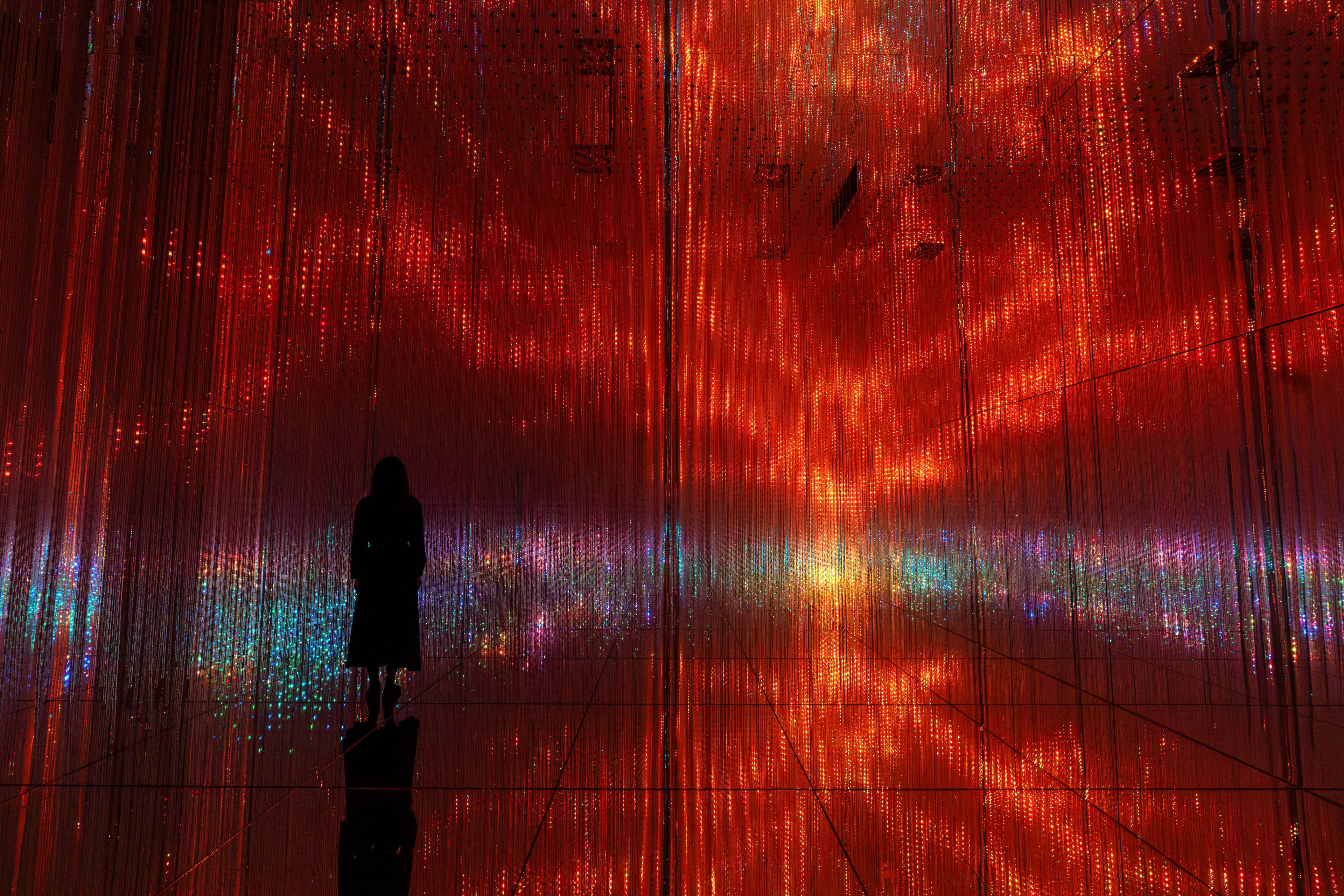 Pointillism uses an accumulation of distinct dots of color to create a picture. Here, light points are used to create three-dimensional objects. The light sculpture extends infinitely in all directions.