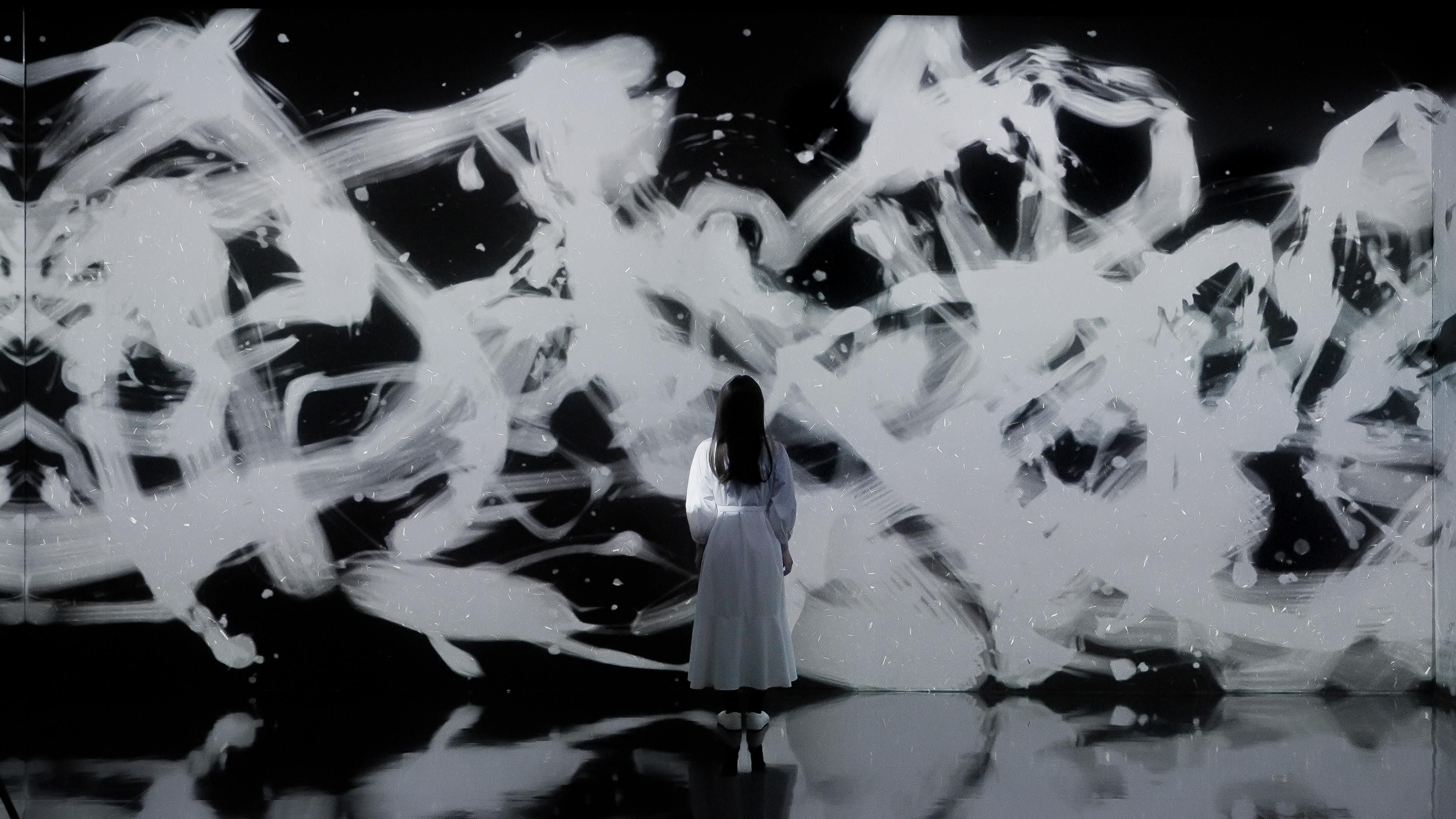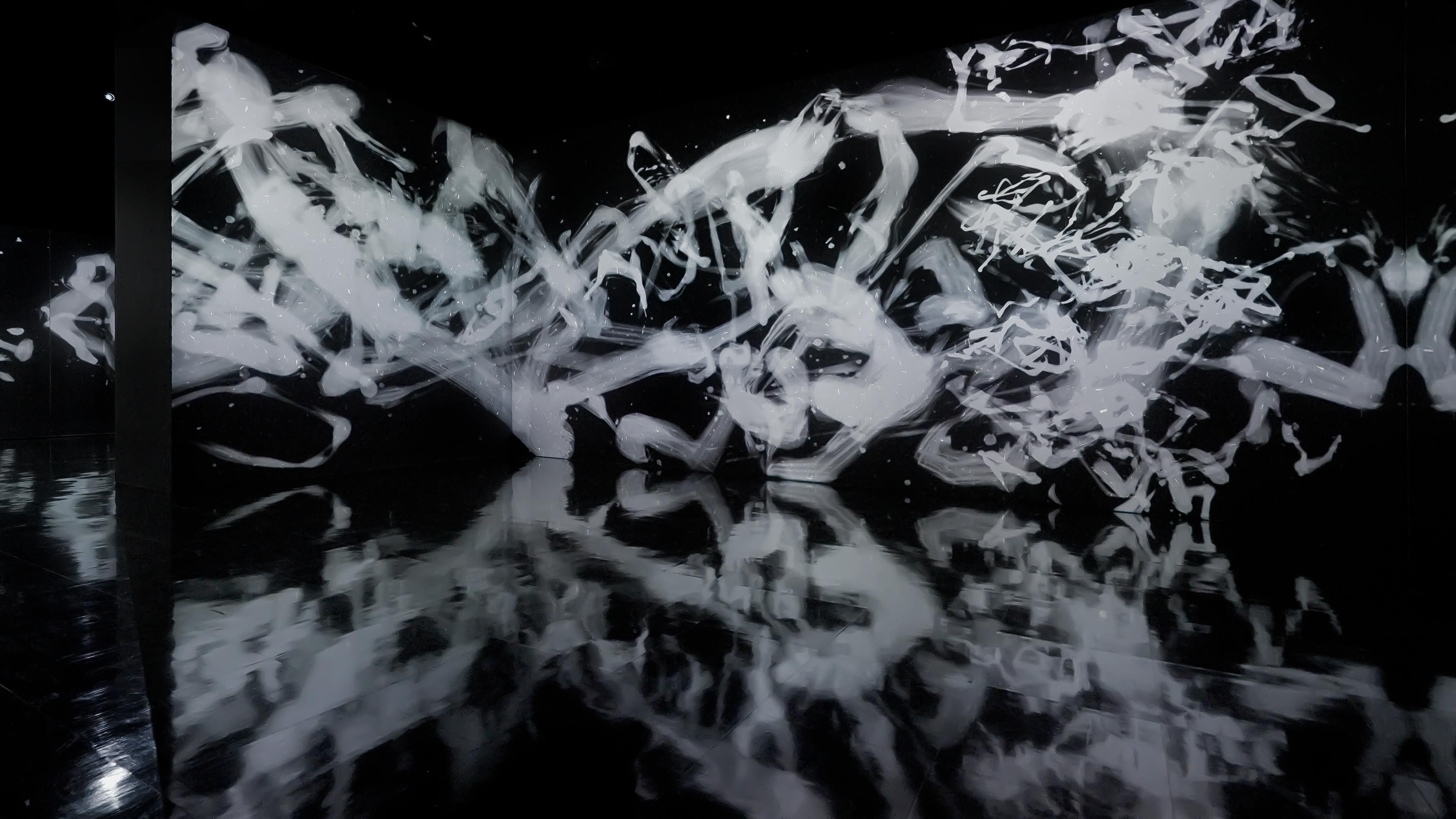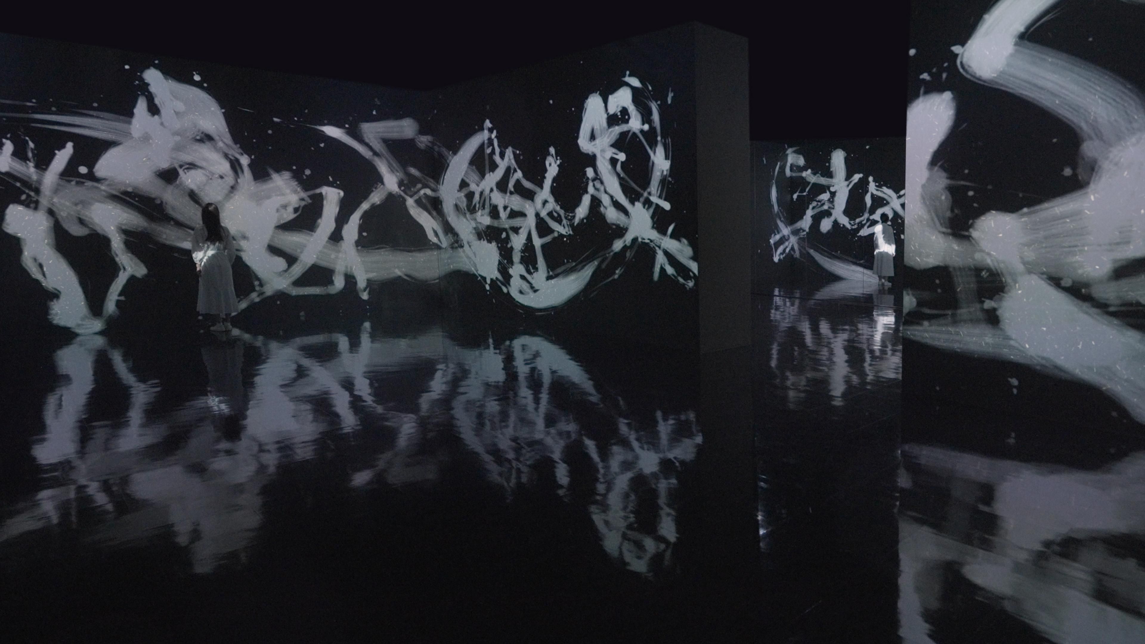 Spatial Calligraphy is a form of calligraphy drawn in space that teamLab has been exploring since it was founded. The artwork reconstructs calligraphy in three-dimensional space to express the depth, speed, and power of the brush stroke, and that calligraphy is then flattened using the logical structure of space that teamLab calls Ultrasubjective Space. The calligraphy shifts between two and three dimensions.