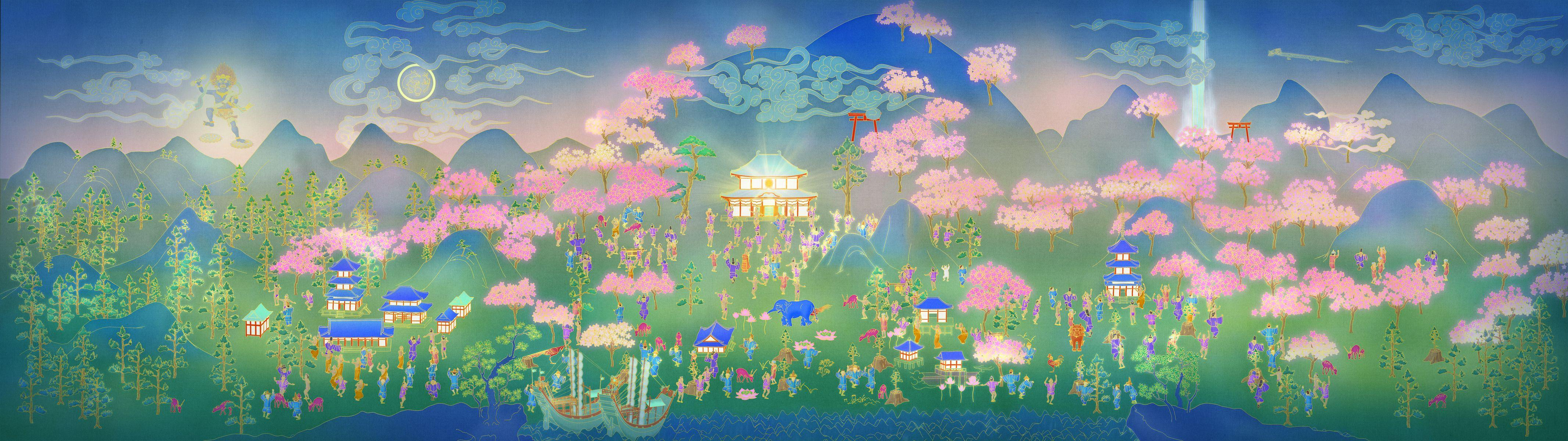 伊藤若冲(Jakuchu Ito,1716-1800)是日本早期现代画家,江户中期活跃于京都。他的绘画风格独特,作品表面由成千上万个色彩各异的方块组成。《涅槃》(Nirvana)的创作灵感源于屏画《鸟》、《动物》、《开花植物和树》、《花》以及《鸟和动物》。 看到若冲的方块绘画,我们便想到电脑生成的像素艺术。据说若冲创作方块绘画的灵感源于工业化大生产背景下无法批量生产设计的西阵织(产于京都西阵的传统优质丝绸织物)。而像素艺术也同样是功能缺陷的产物。现在像素艺术的功能缺陷已经克服,且其作为广受欢迎的表达形式也得以保留。这也许能够解释为什么看到若冲的方块作品,我们便会本能地想到数字艺术。在他的作品中,色彩也是在方块内混合了不同颜色的光学现象的产物。在印象派和点彩派出现之前,若冲似乎就懂得运用光学混彩了。 这件艺术作品是在三维虚拟空间中创作的,三维动物在空间中活动。teamLab将三维空间转化为超主观空间。用方块色谱对三维空间中的颜色进行分割。例如,如果一个方块中填充的是红色和蓝色,那么在三维空间中,这个方块便会以紫色呈现。