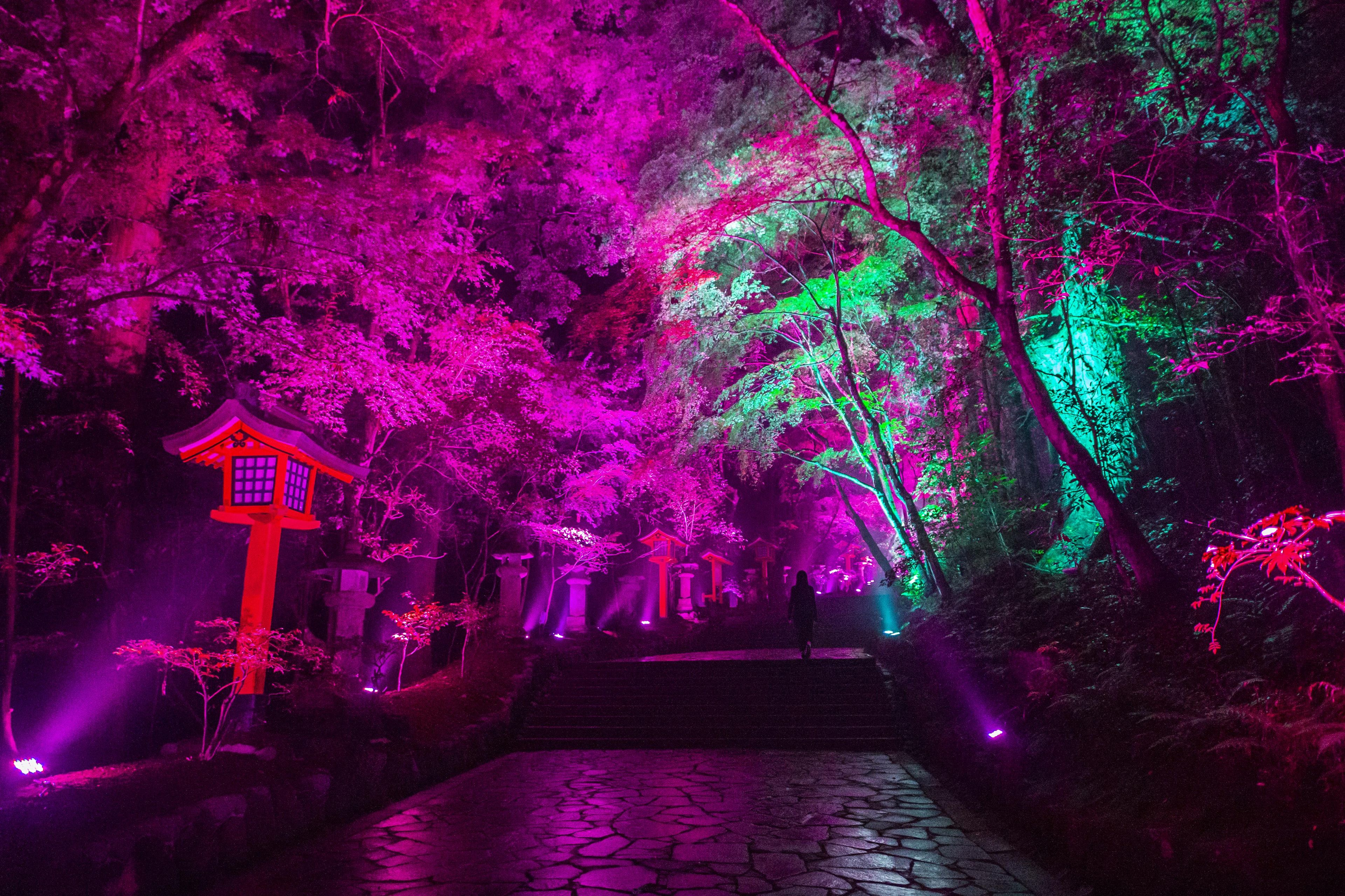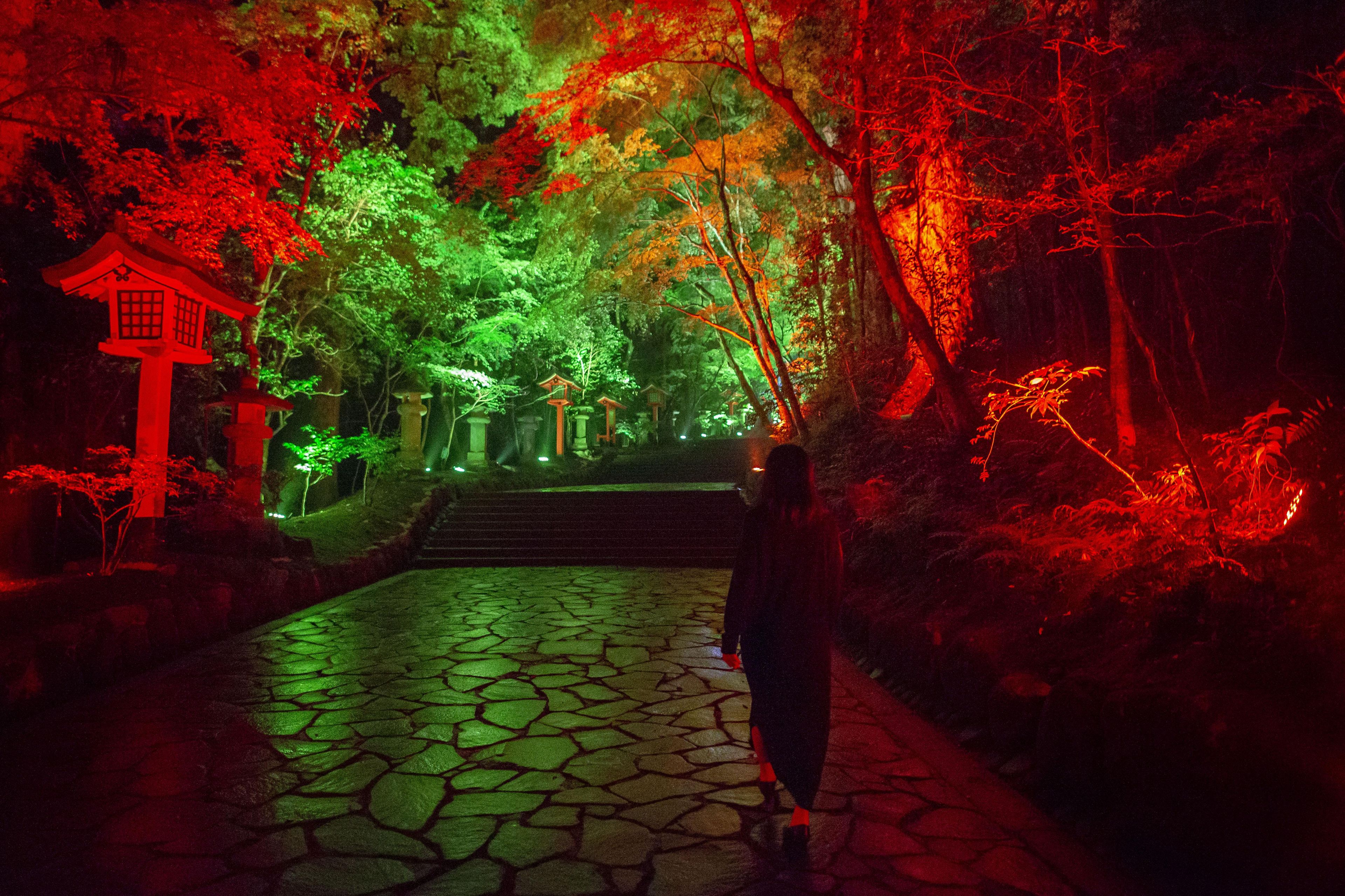 大分県宇佐市の宇佐神宮境内を光のアートで彩るイベント「光の祭 Art by teamLab(アート・バイ・チームラボ)」が開かれている。7日まで。(Excerpt from the text)