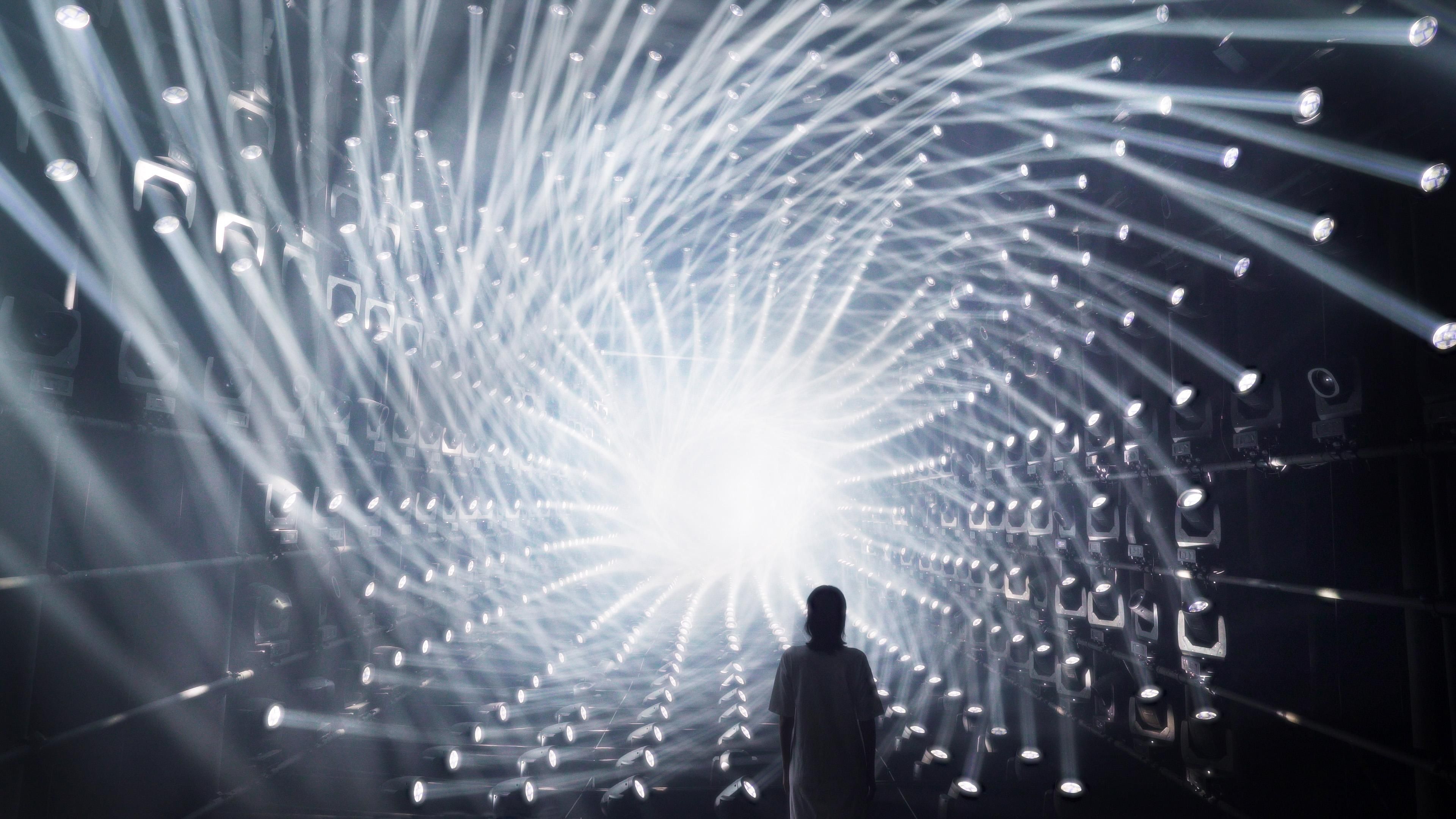 In the centre of the space due to a haze being created a three-dimensional object is born.