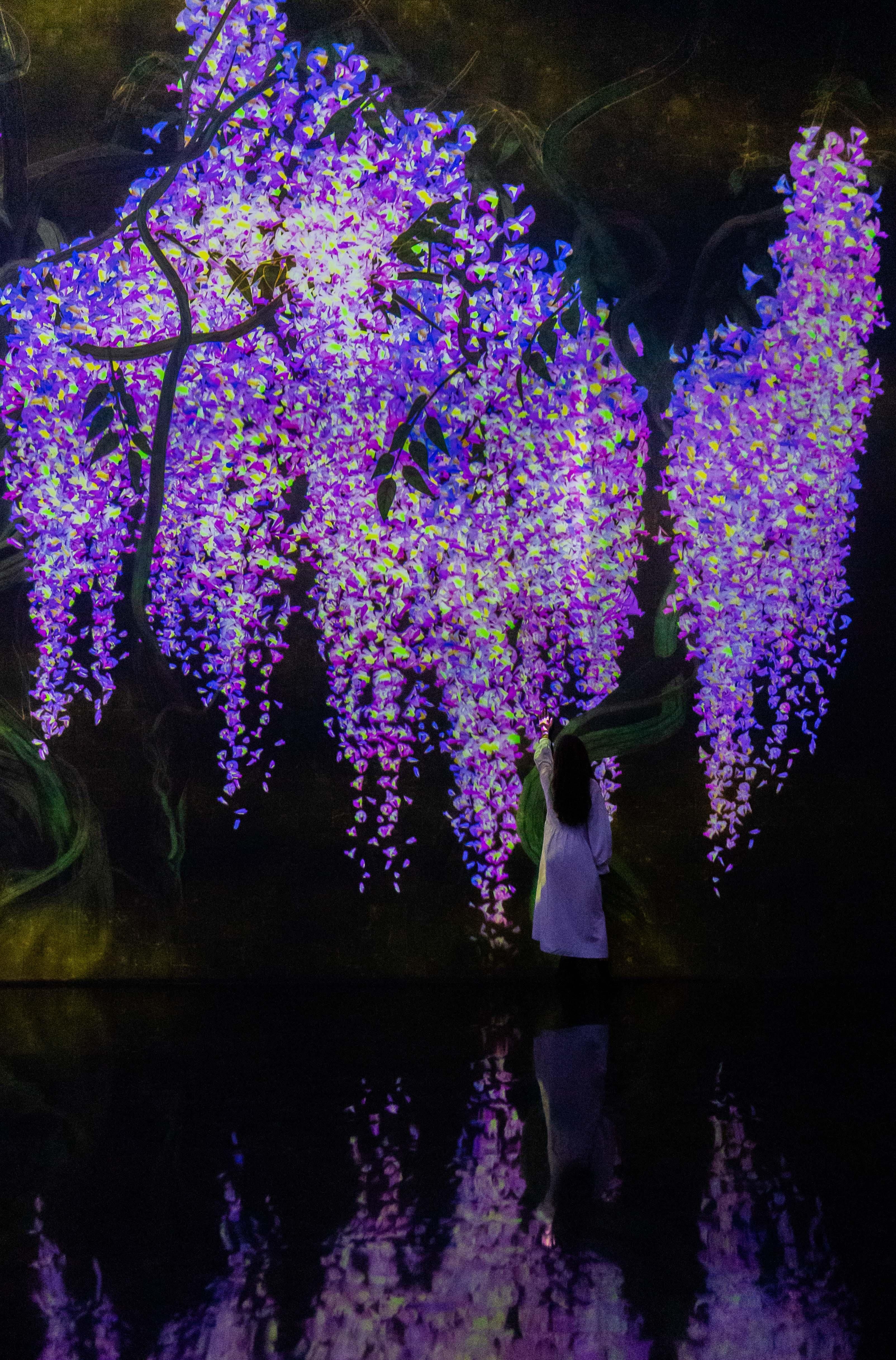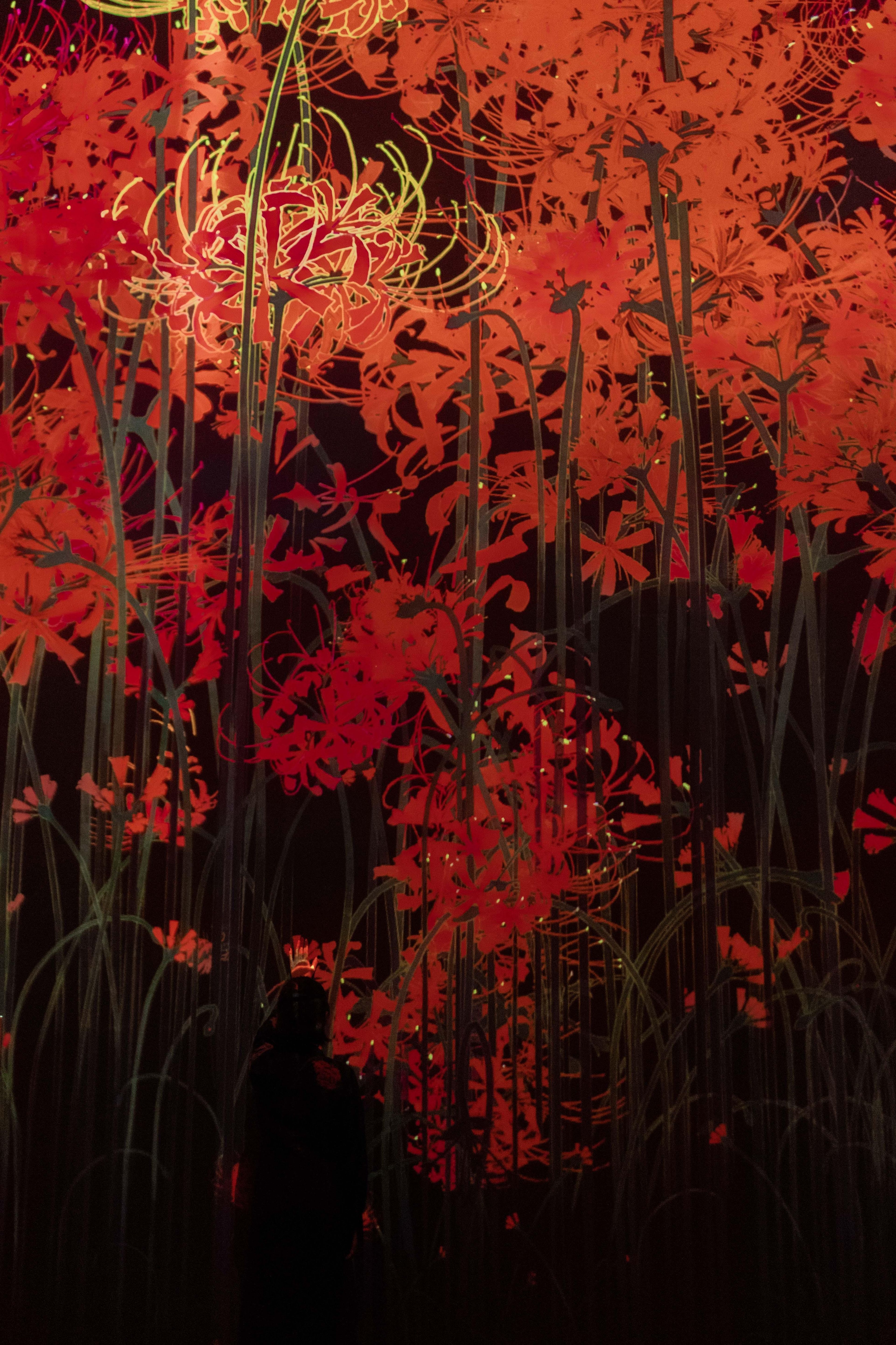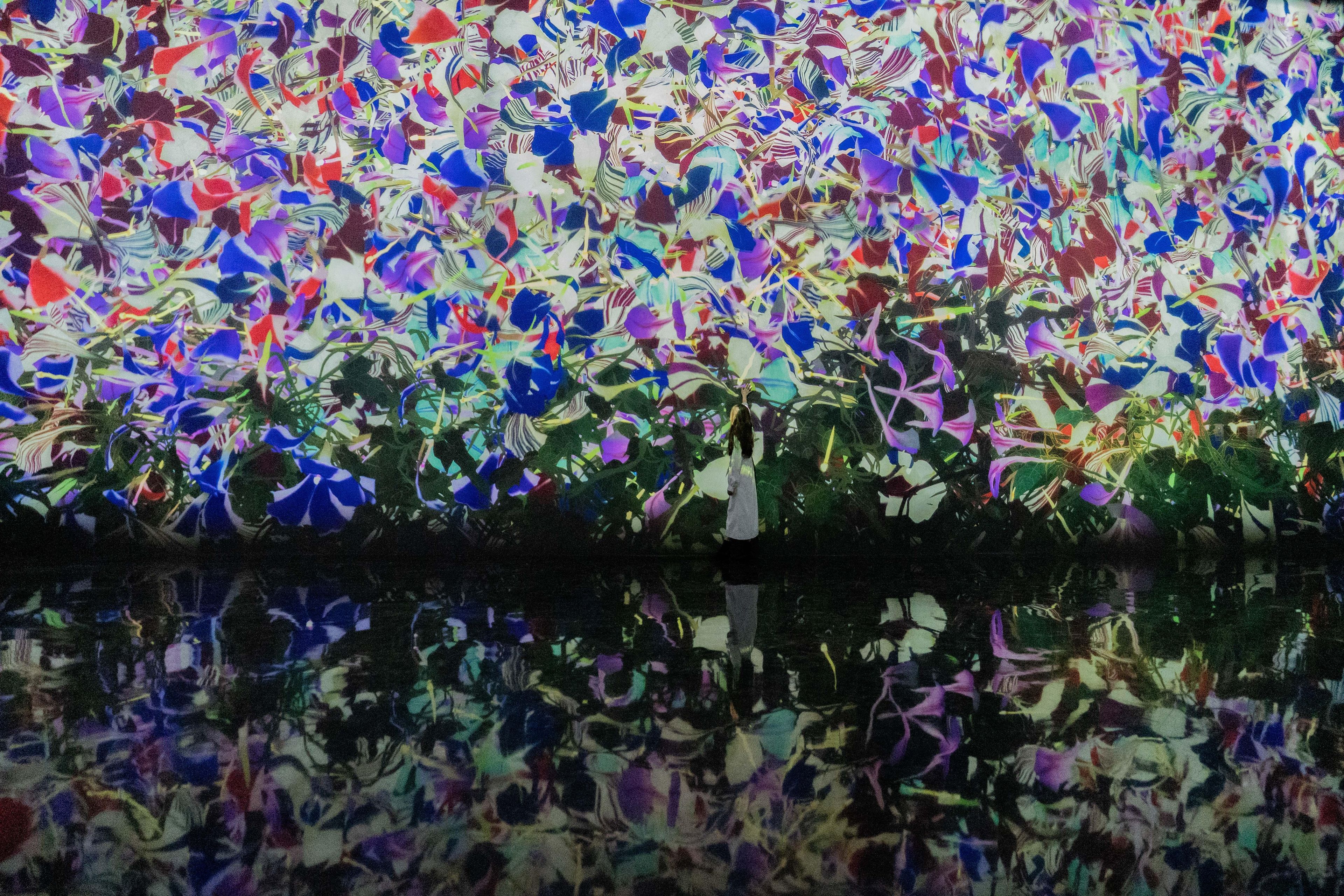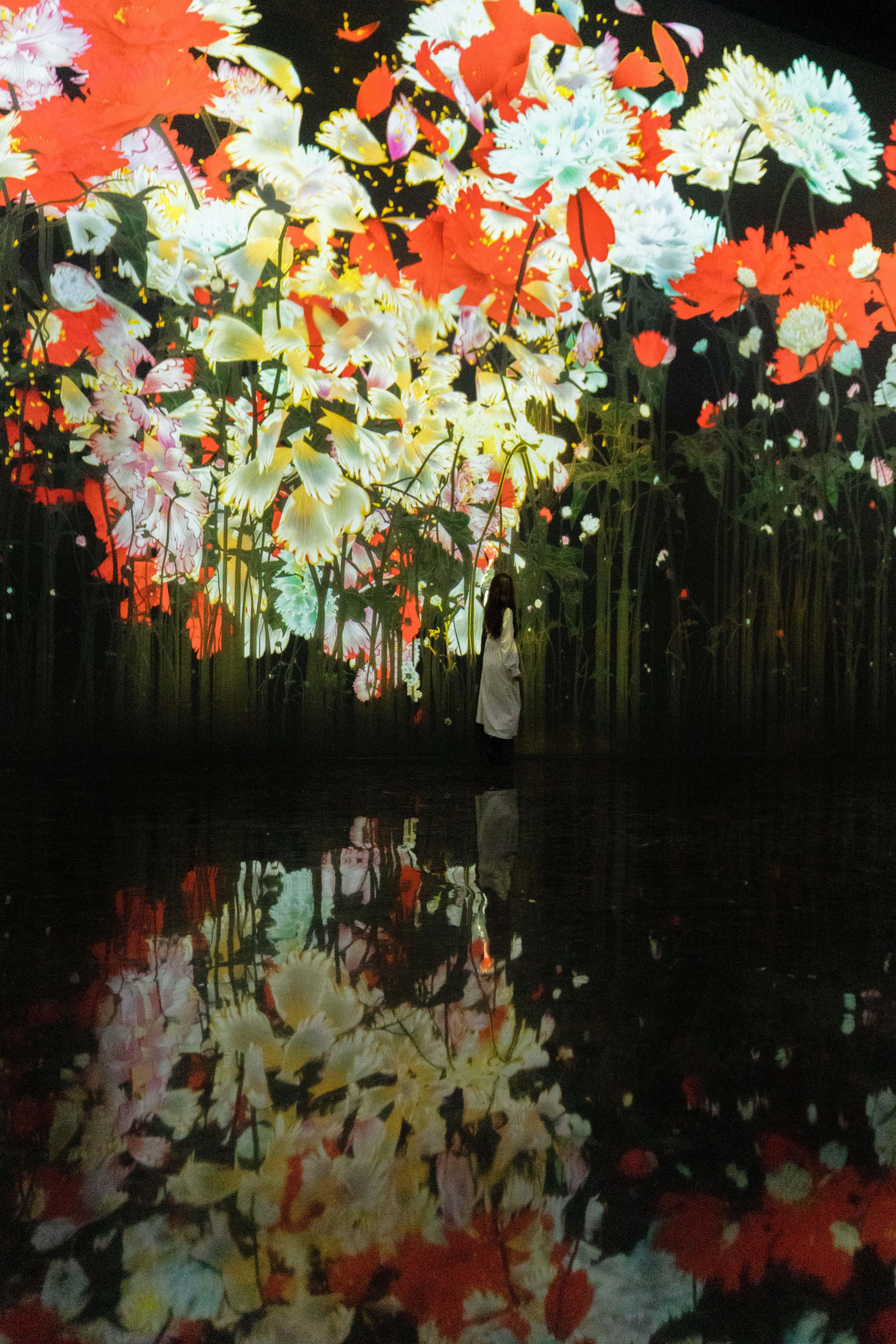 作品的世界,是基于teamLab所发想的「超主观空间」理论平面化而来的,因此不同于由镜头或透视法平面化而来的空间,观赏者的视角不会被固定,身体也会变得自由可动。映出作品世界的墙壁不会成为我们与作品的界线,花与作品的边界面变得模糊,作品世界与人们身体所在的空间互相连续。