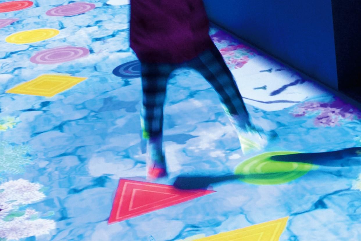 ※《天才跳房子》将○△□的符号投影在地面上。孩子们跳落在○△□ 形状的符号上时就会发出声音,并出现不同的颜色。连续跳落在同样形状或同样颜色的符号上会产生更加美妙的颜色和声音。孩子们可以用全身去体验,更厉害的孩子还能通过发现形状和颜色之间的关系瞬间改变整个空间。所以,这件作品有助于启发孩子的身心潜能。
