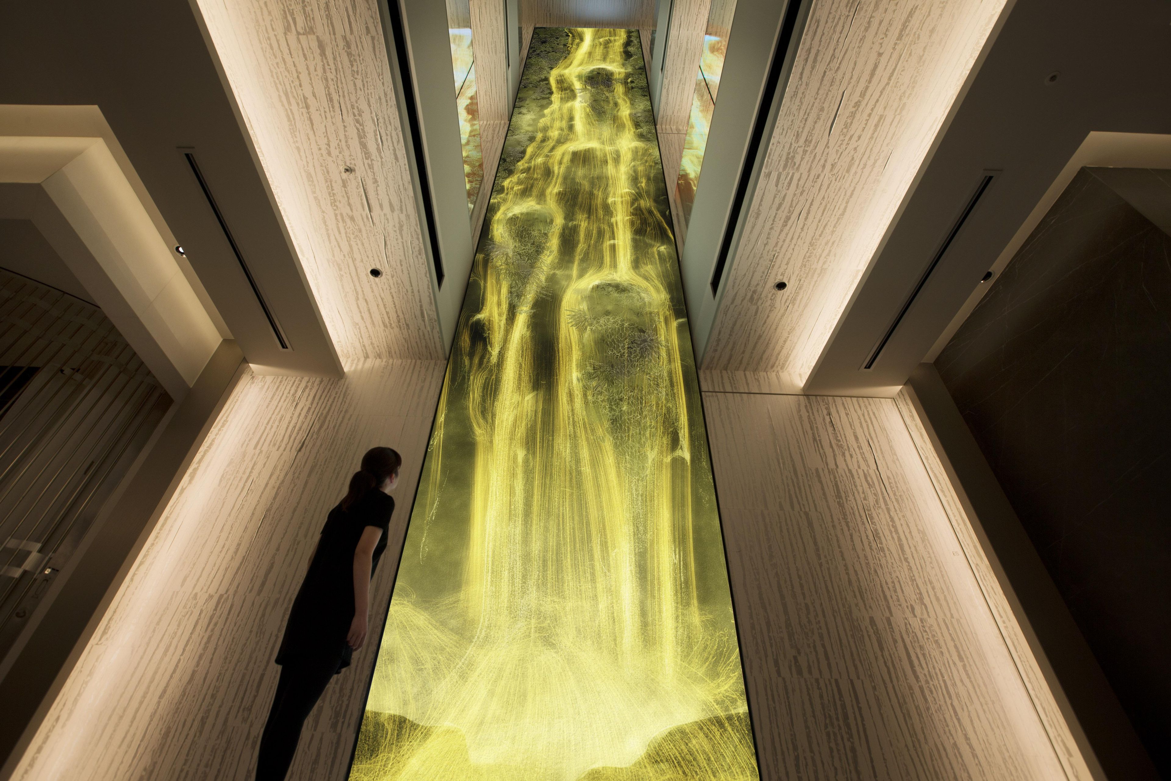 然後在所有的水粒子之中随机挑选出0.1%的水粒子,根据这些水粒子的举动在空间中描绘出线。而这些「线的集合」就形成了本作品中的瀑布。