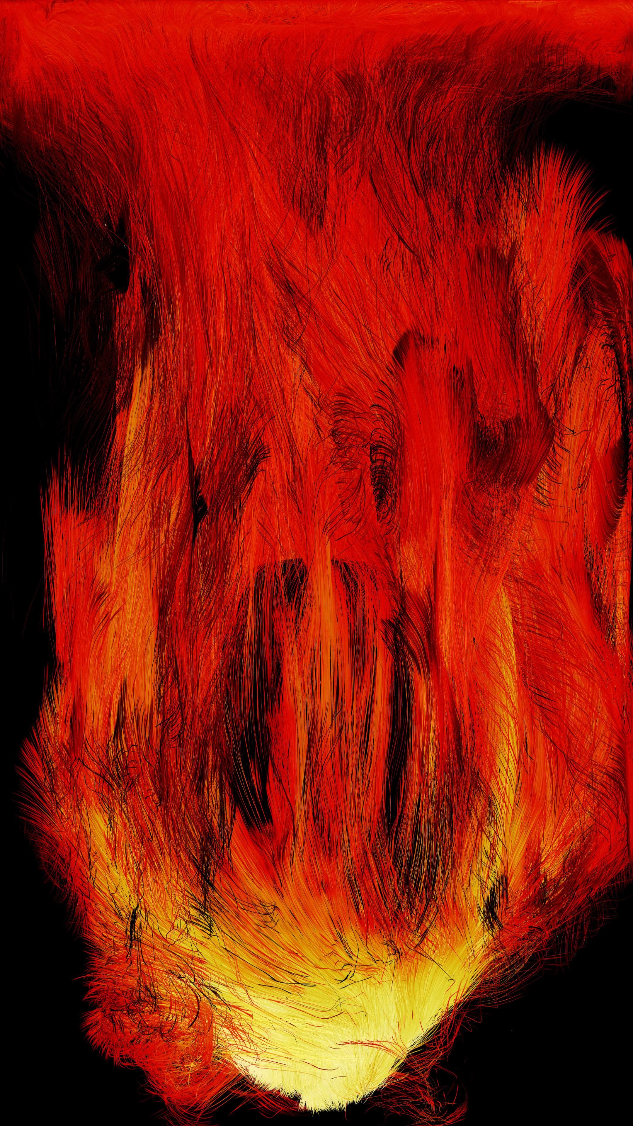 气体燃烧所产生的气流,在空间中描画出线条,这些线的立体集合构成了火焰, 根据teamLab的 "超主体空间 "概念进行平面化处理而描绘出火焰。