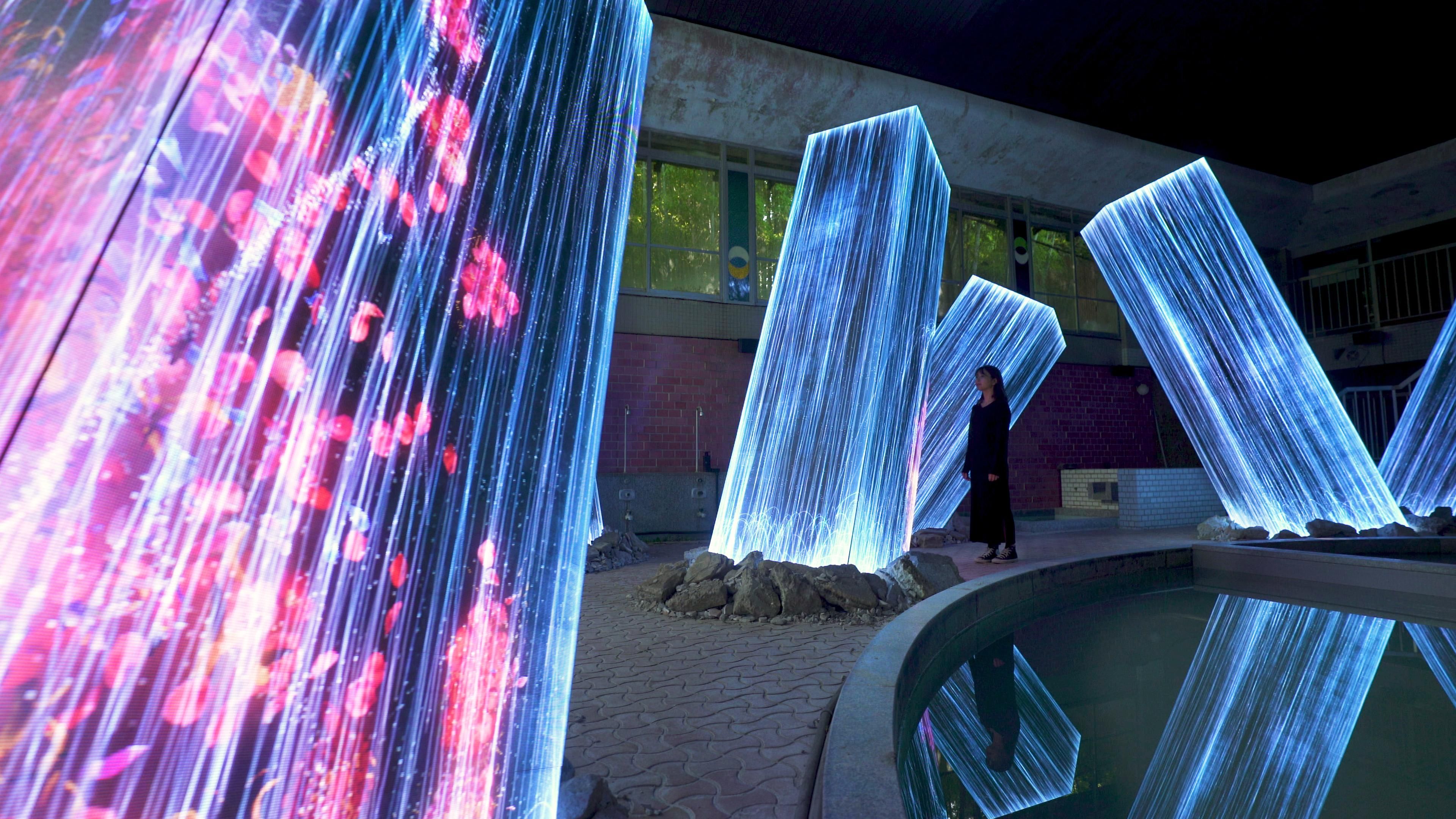 Masses (Megaliths) of different space-times are clustered in the bath house ruins.The forest surrounding the bath house ruins is home to 3,000-year-old trees, and it changes daily with the imperceptible, slow flow of time, repeating every year, as a space where the endlessly long time accumulates. The ruins from ages past scattered in the forest and the Edo-period garden which remains today each have their own respective space-times. The bath house was made in modern times, but after just a short period, it was abandoned, becoming a space-time where time had stopped completely. And this group of megaliths is also a mass made up of compressed space-times where the flow of time varies. Here, various space-times intersect and overlap.Each megalith is surrounded by similarly standing megaliths, the space-times of which are all connected. The artwork is continuously rendered in real time by a computer program. It is neither prerecorded, nor on loop. As a whole, previous states never recur, and the artwork is continuously changing due to the movement of people. Every moment is unique and can never be seen again.The following artworks exist in the artwork space of the three-dimensional objects grouped in these bath house ruins.・Flowers and PeopleThis artwork is in a state of continuous change. Over a period of one hour, a year’s worth of seasonal flowers blossoms and scatters. The flowers bud, grow, and blossom before their petals begin to wither and eventually fade away. The cycle of growth and decay repeats itself in perpetuity. If a person stays still, the flowers surrounding them grow and bloom more abundantly.・Universe of Water ParticlesWhen people approach the artwork, the flow of the water changes. The movement of people influences the artwork, causing it to evolve continuously, while the artwork influences other works. For instance, the water causes the flowers in the work Flowers and People to scatter.Water is represented by a continuum of numerous water particles. The interaction between the particles is calculated and then lines are drawn in relation to the behavior of the water particles. The lines are “flattened” using what teamLab considers to be ultrasubjective space.