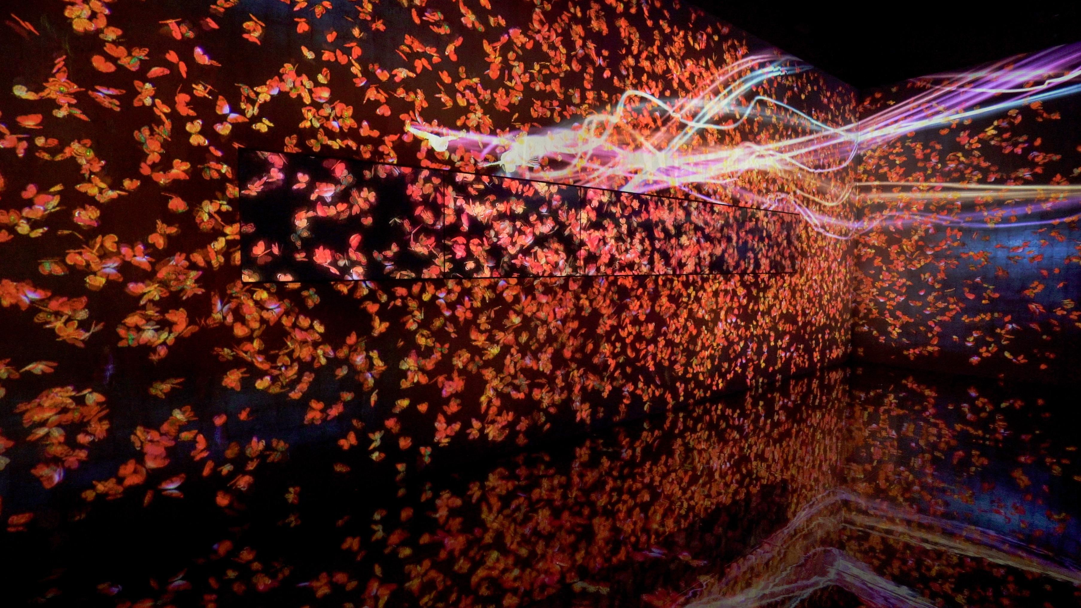 Crows are rendered in light as they fly around the space, leaving trails of light in their paths and creating Spatial Calligraphy. The crows chase one another and in turn become chased themselves. When the chased crows crash into one another, they scatter, turning into flowers. The crows attempt to fly around people in the space, but when they crash into a viewer, they scatter, turning into flowers in the same way.