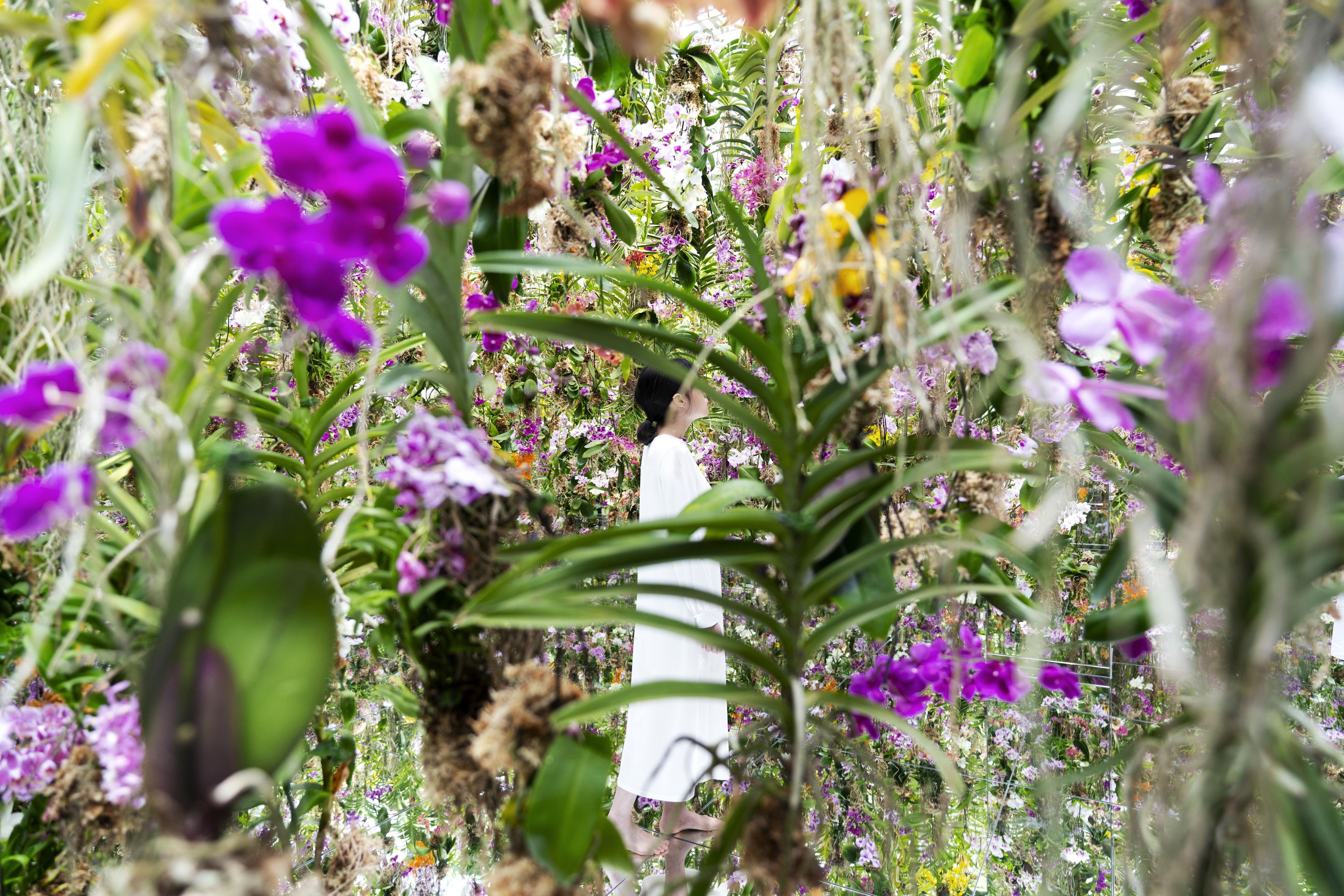 同時,蘭花與傳粉昆蟲共同進化的事例也被廣泛認知,配合它的昆蟲夥伴的作息時間,改變其自身散發的花香濃度。因此,空間內所充斥的花香在早晨、中午、傍晚,夜間等不同的時段裡也是時刻變化的。因為本作品中與夜行性昆蟲配合的蘭花較多,所以夜晚時超高密度的蘭花所發出的花香是本作品精髓之處。