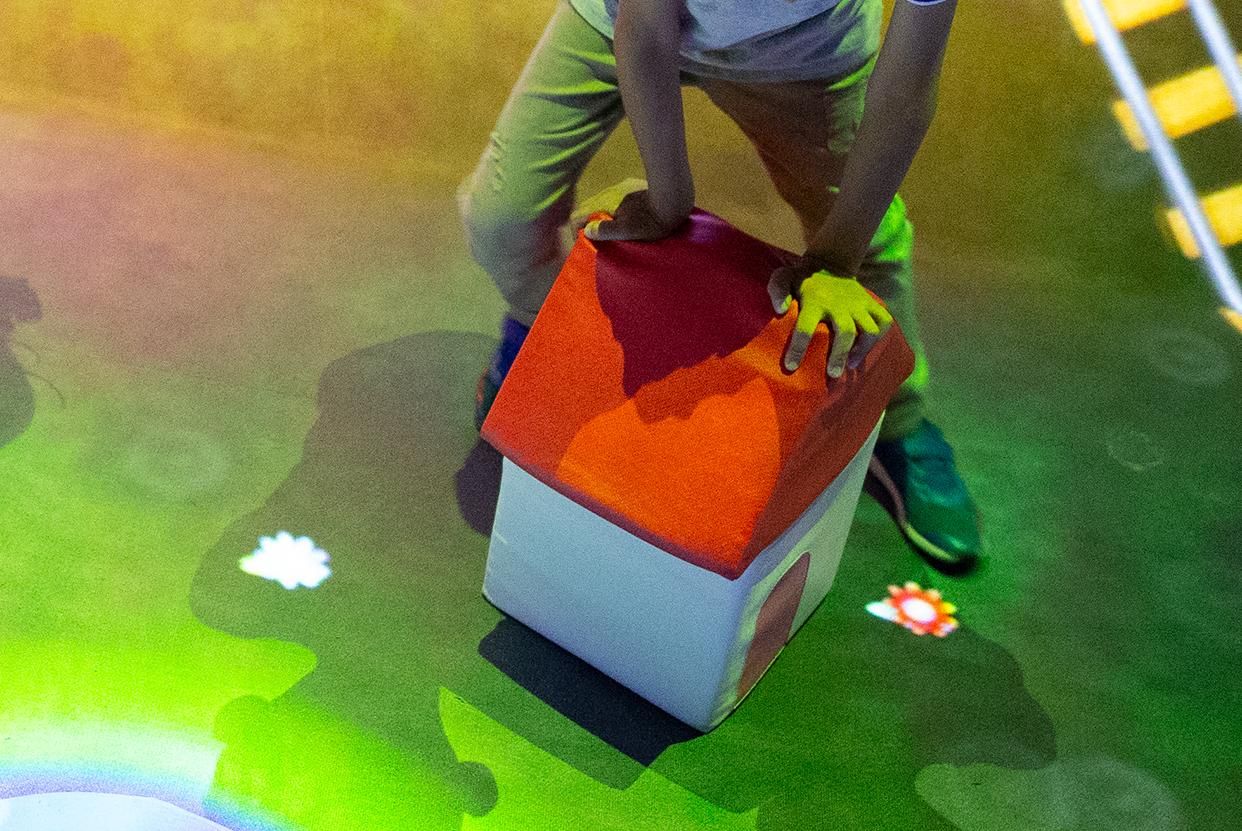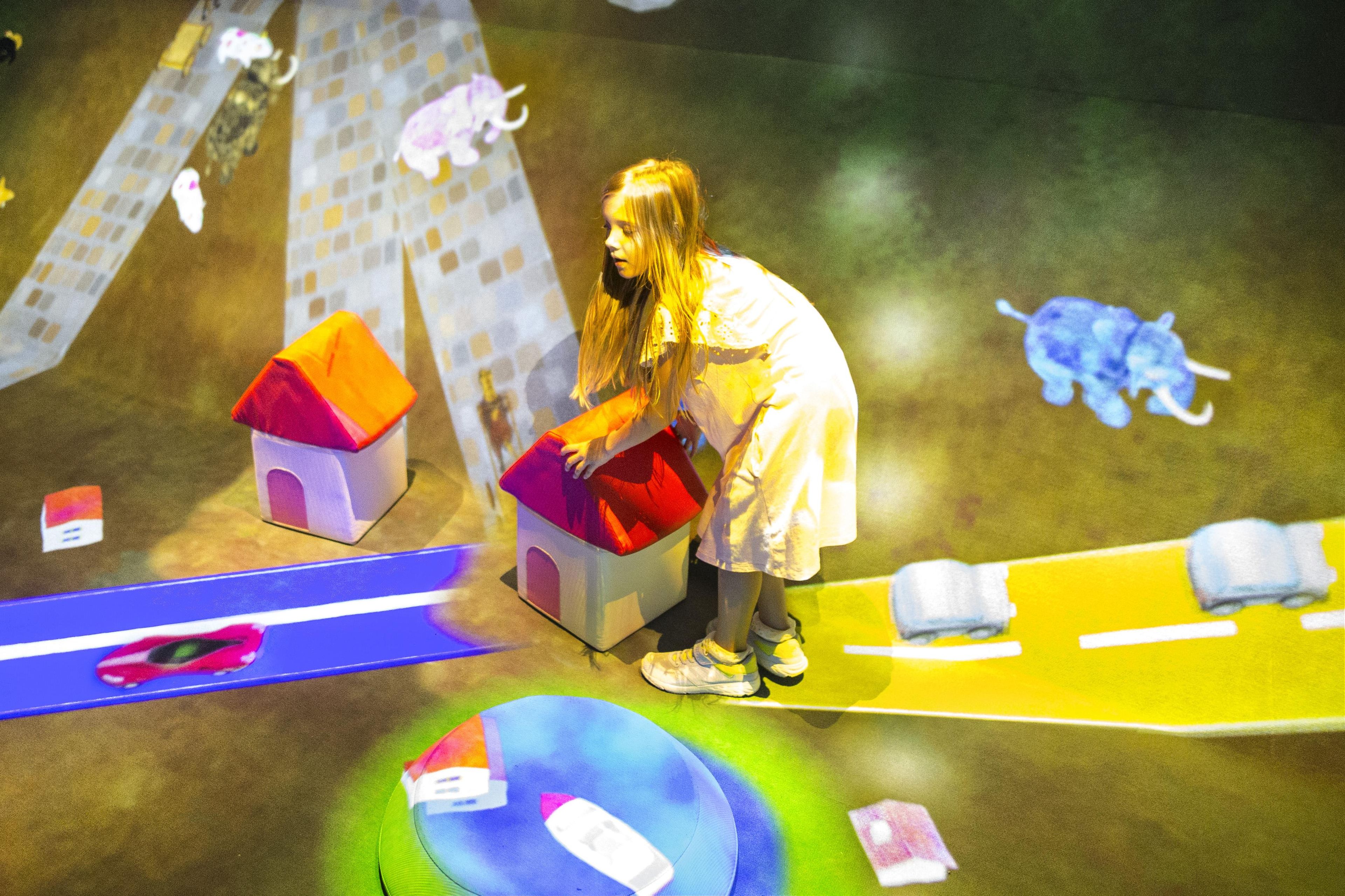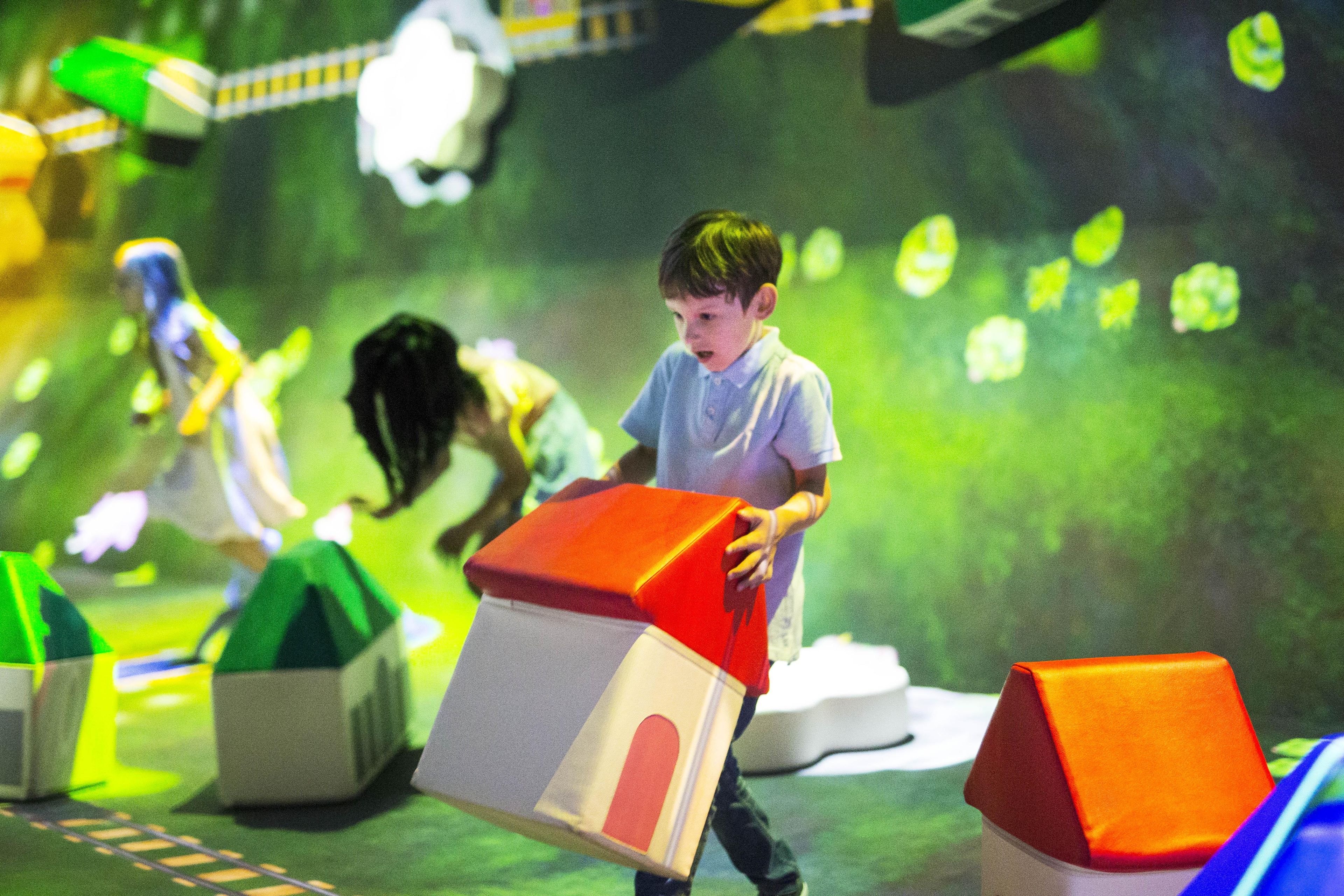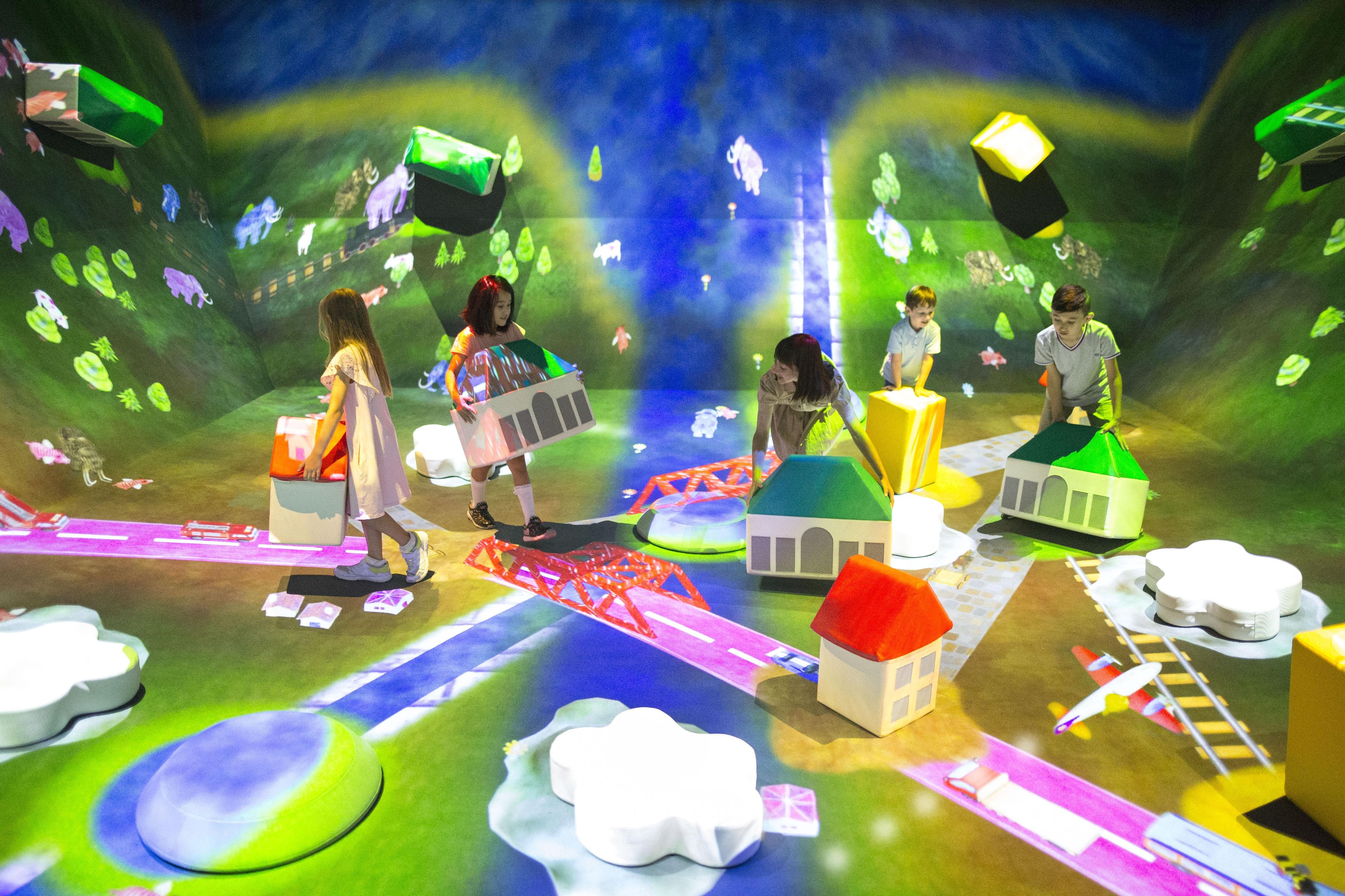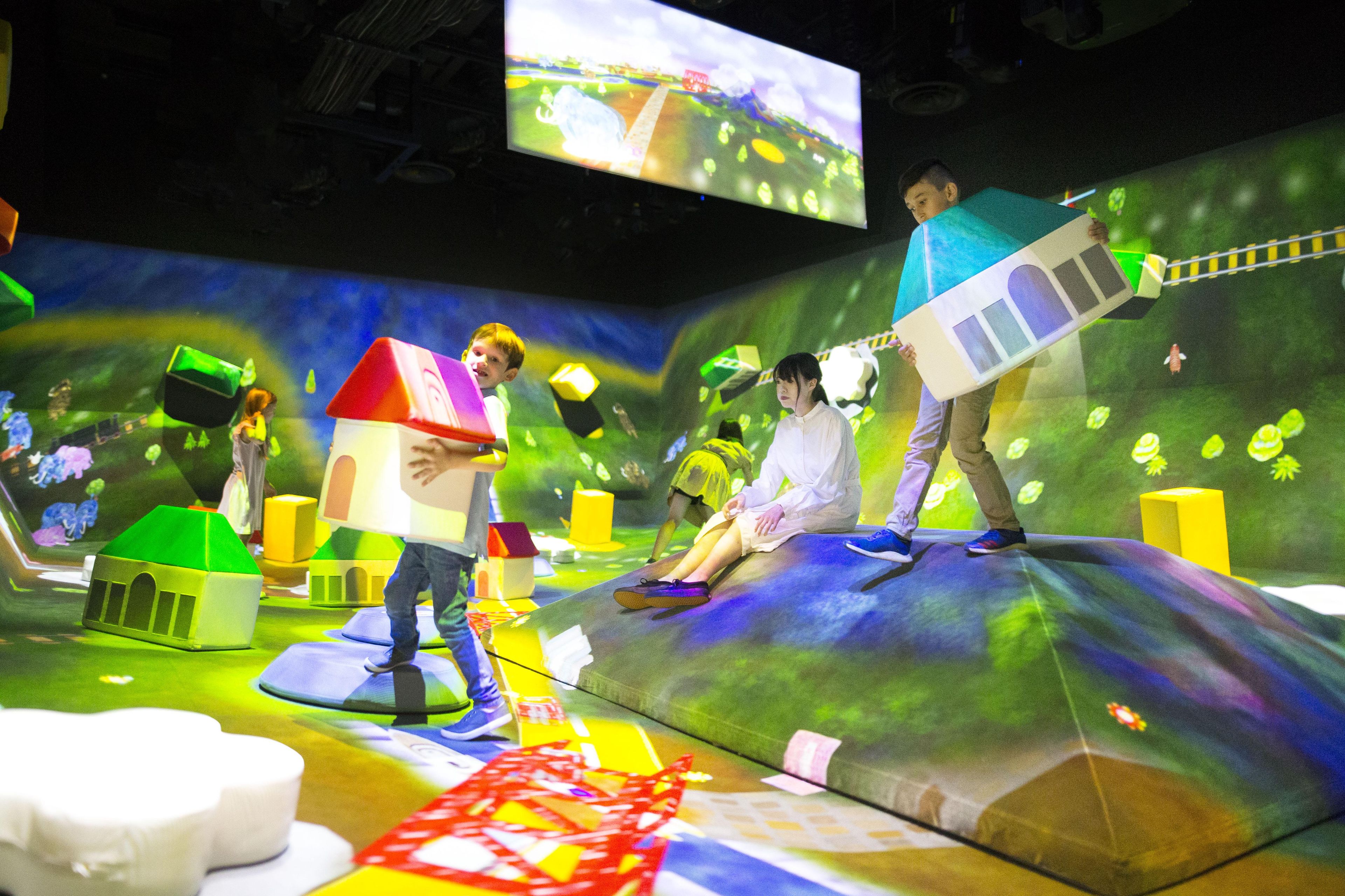 在空間裡放置有房屋、車站與大樓等形狀的巨大積木。2