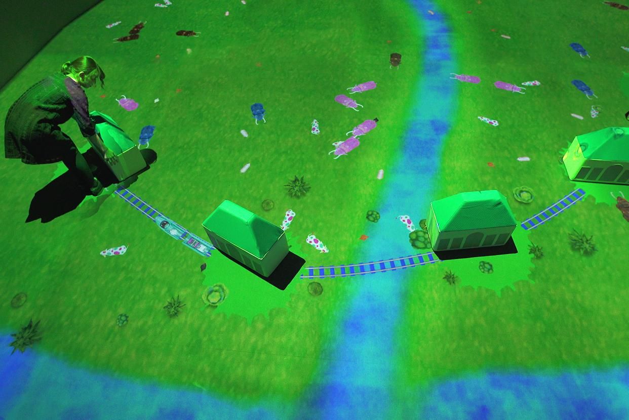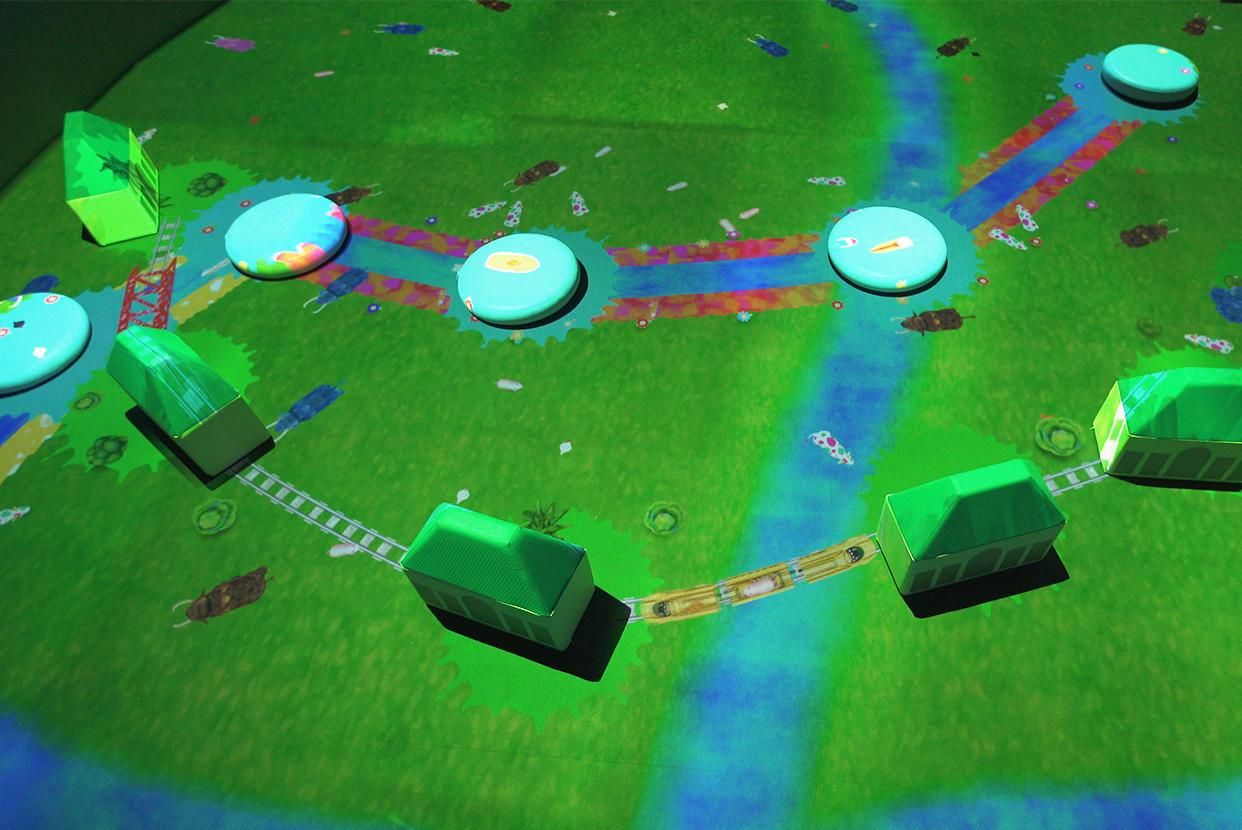 若將同類的積木放在附近,它們便會相連,出現行駛的交通工具。積木越連越多,交通工具也會越發進化。大廈會有直升機飛出,從直升機鳥瞰到的世界則會投射在上空的螢幕中。