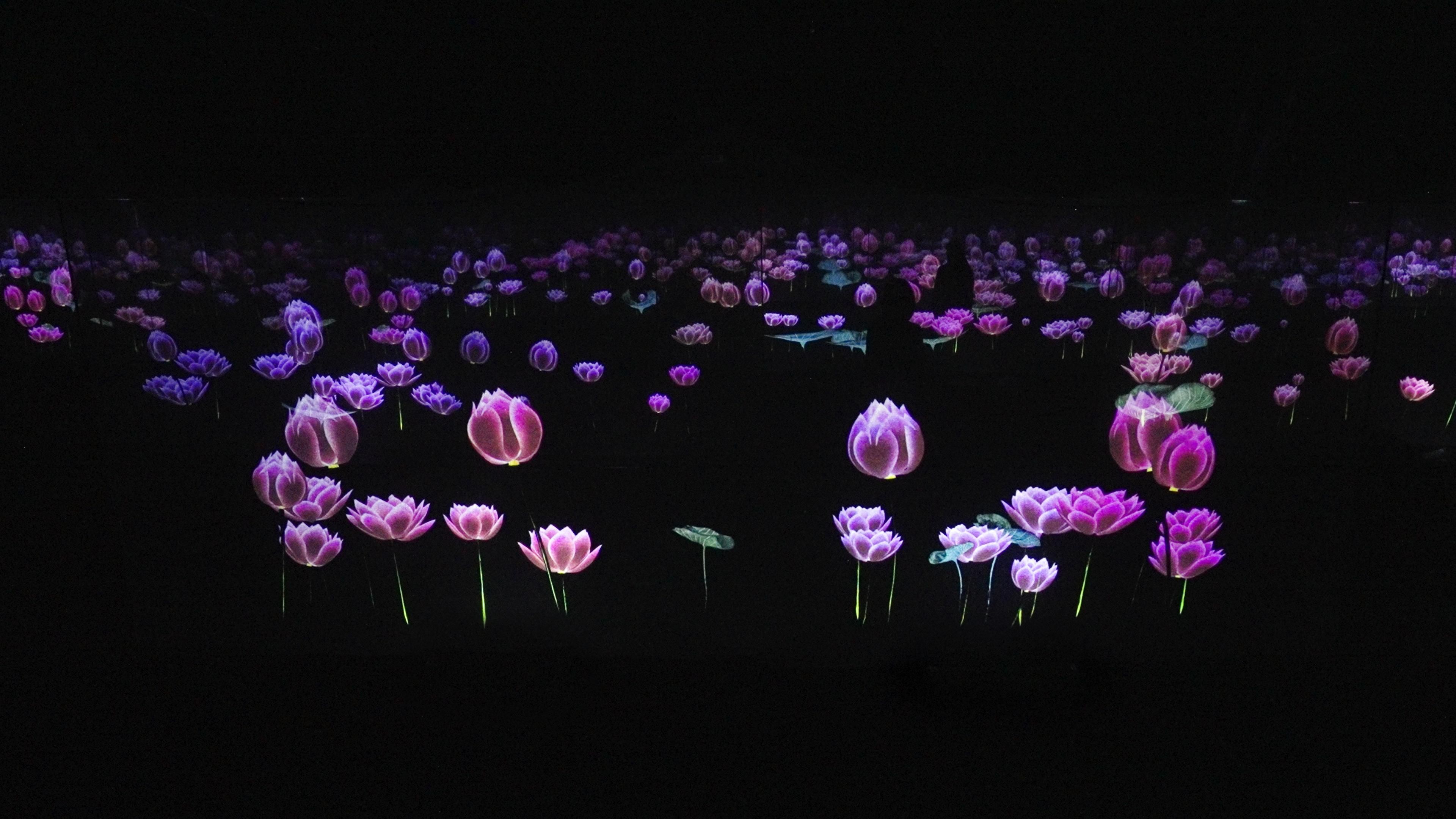 To the viewer, the other people covered in the lotus flowers exist in the world of the artwork, and when the viewer is seen by others covered in the lotus flowers, they also exist in the space of the artwork.