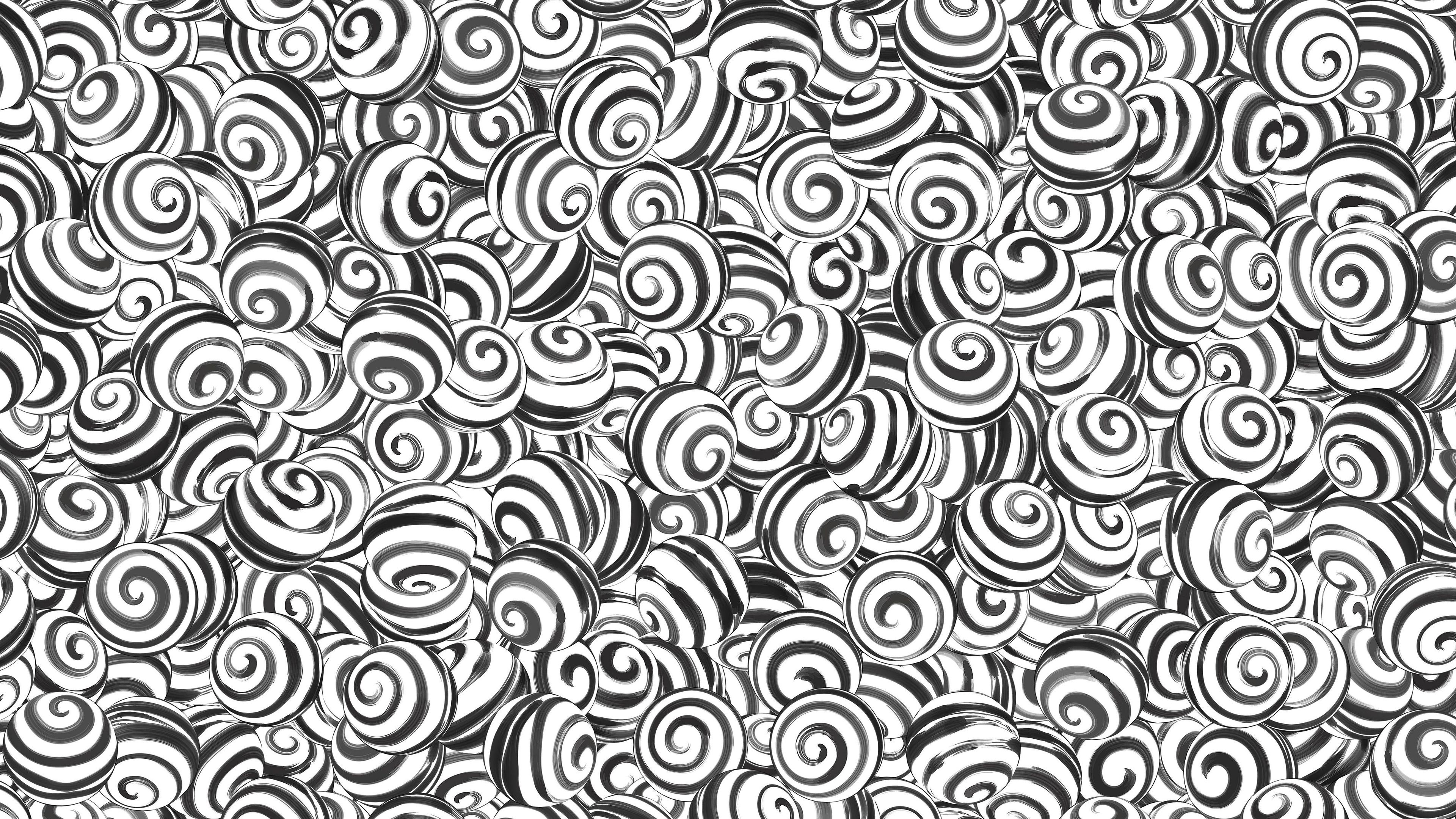 然後再把同樣的球體無序的排列,把無序排列的漩渦球群體通過超主觀空間理論進行平面化後,描繪在左屏。
