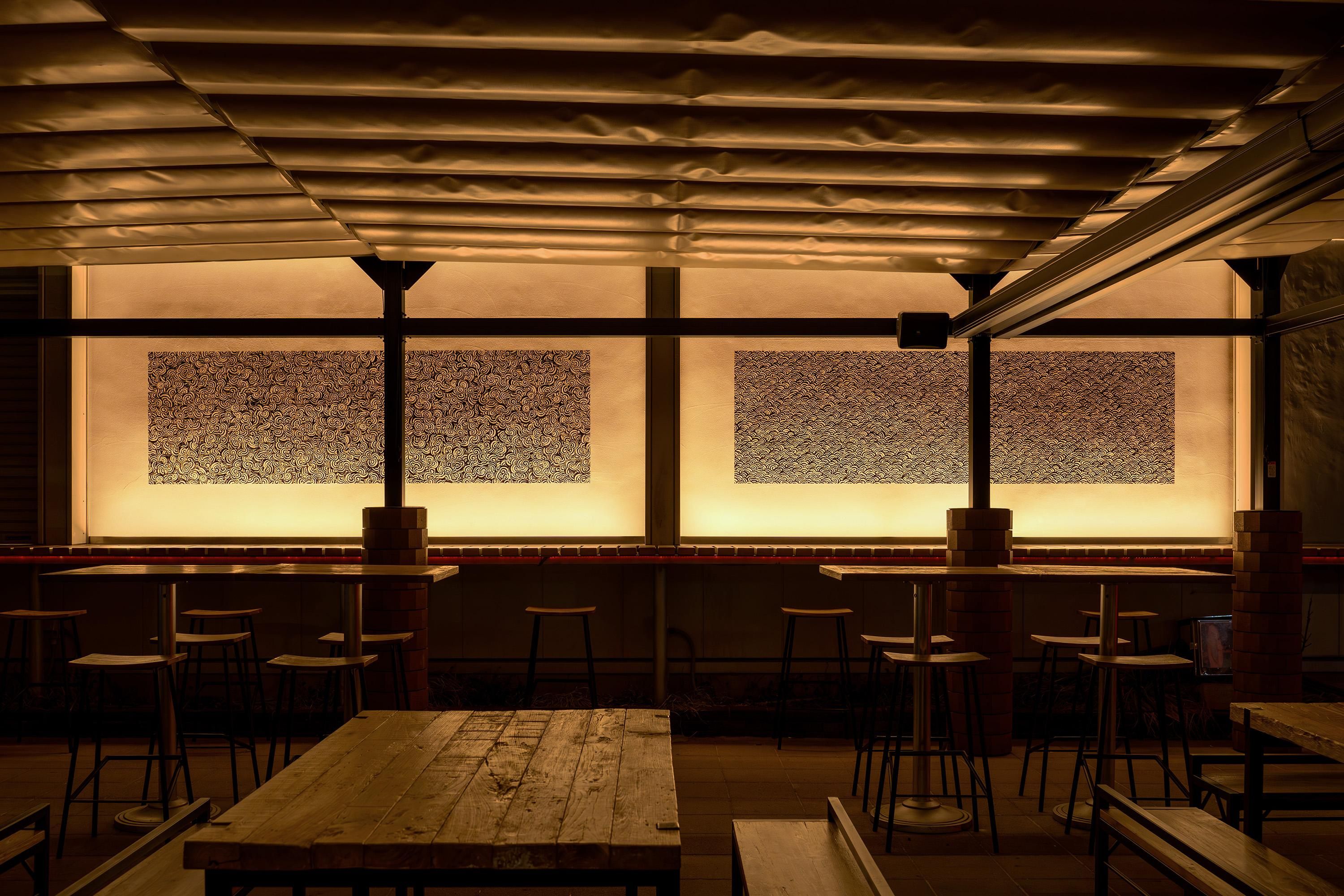 我們在三次元世界重新詮釋,在球體上描繪漩渦,把自由旋轉狀態的球體形成一定的秩序排列,再把漩渦球群體通過超主觀空間理論進行平面化後,描繪在右屏。