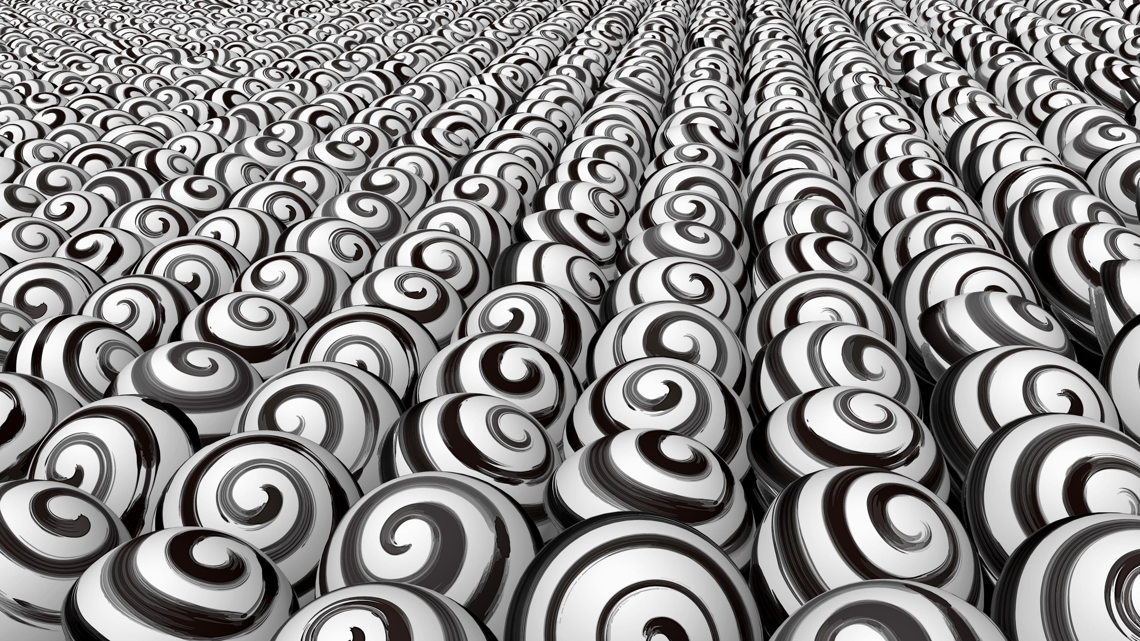 We reinterpreted the blue ocean waves in three dimensions and drew whirlpools on a sphere so that the blue ocean waves are seen from the side and the whirlpools are seen from above. The spheres in free rotation are arranged in an orderly fashion. (Image: Perspective)