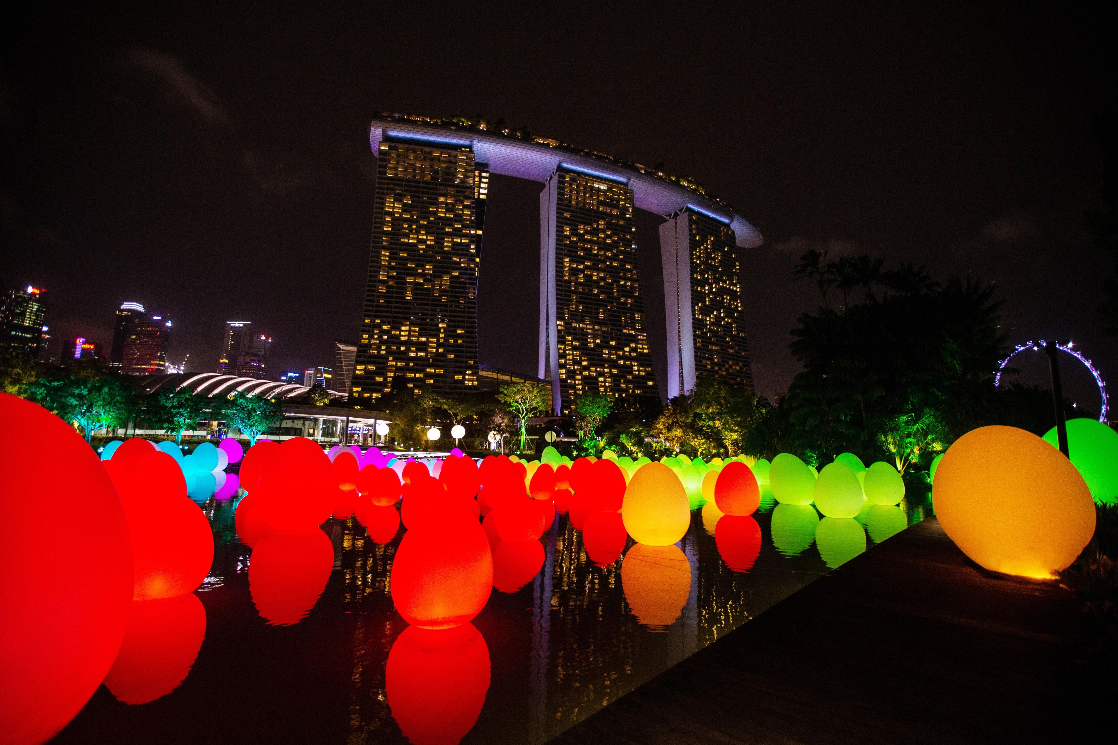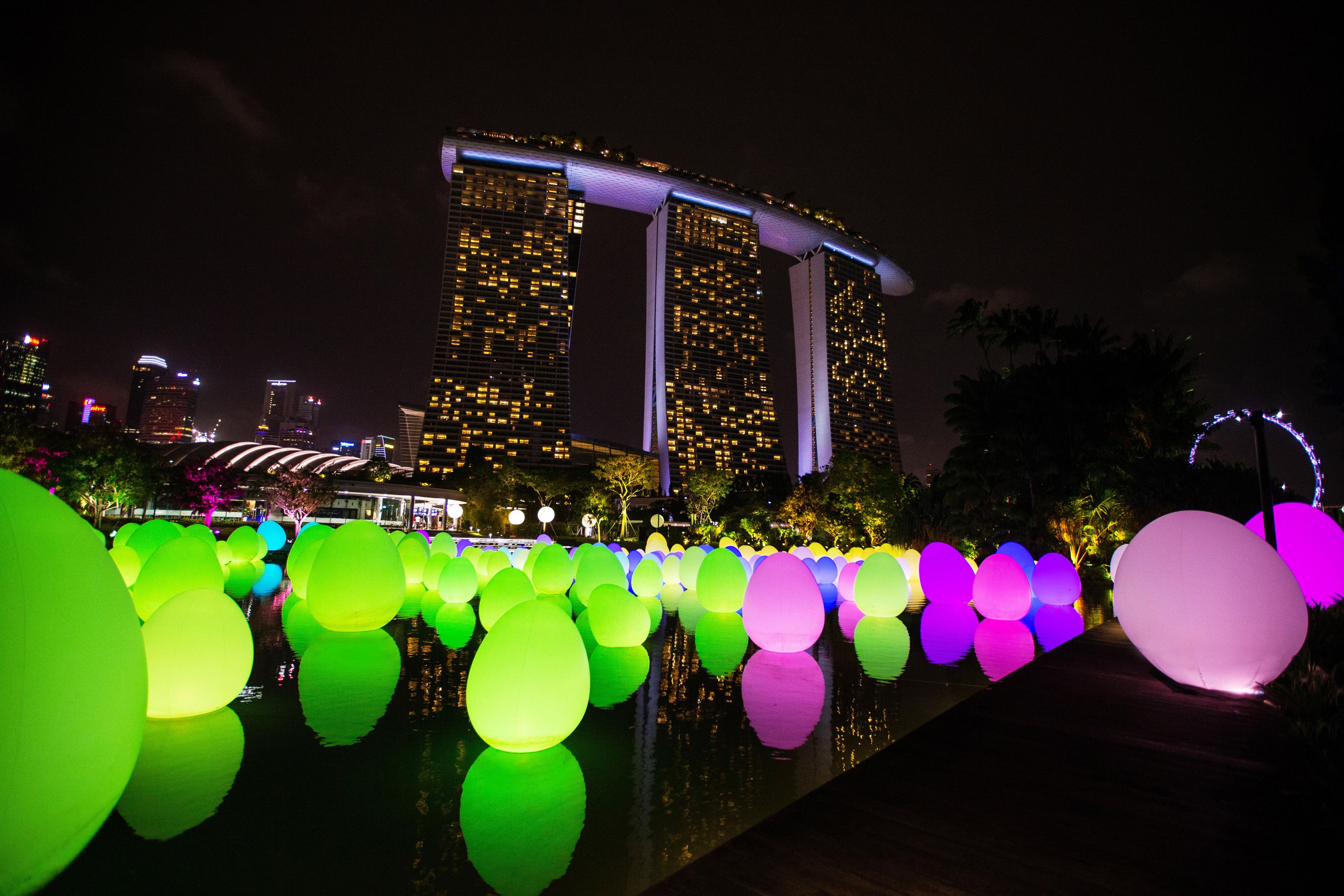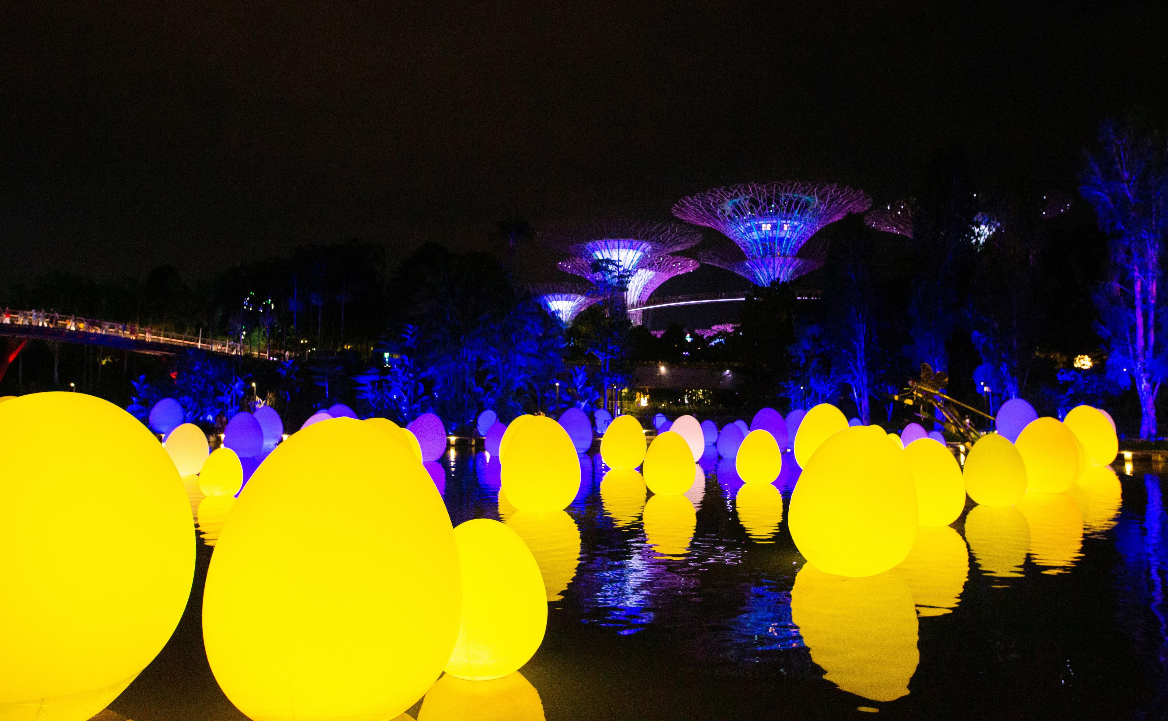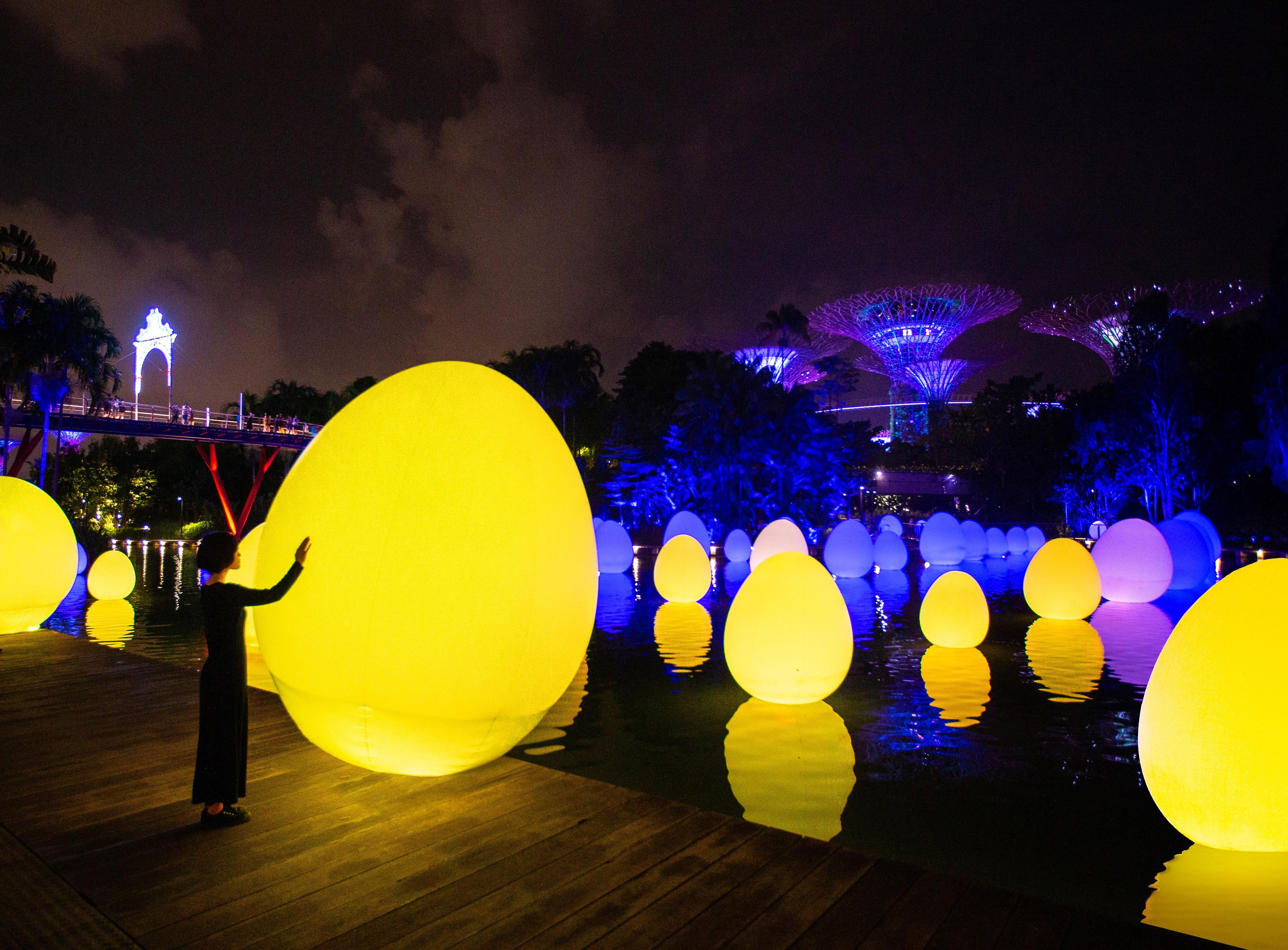 佇立在蜻蜓湖上,發光的蛋狀物與湖畔的樹木交相輝映。