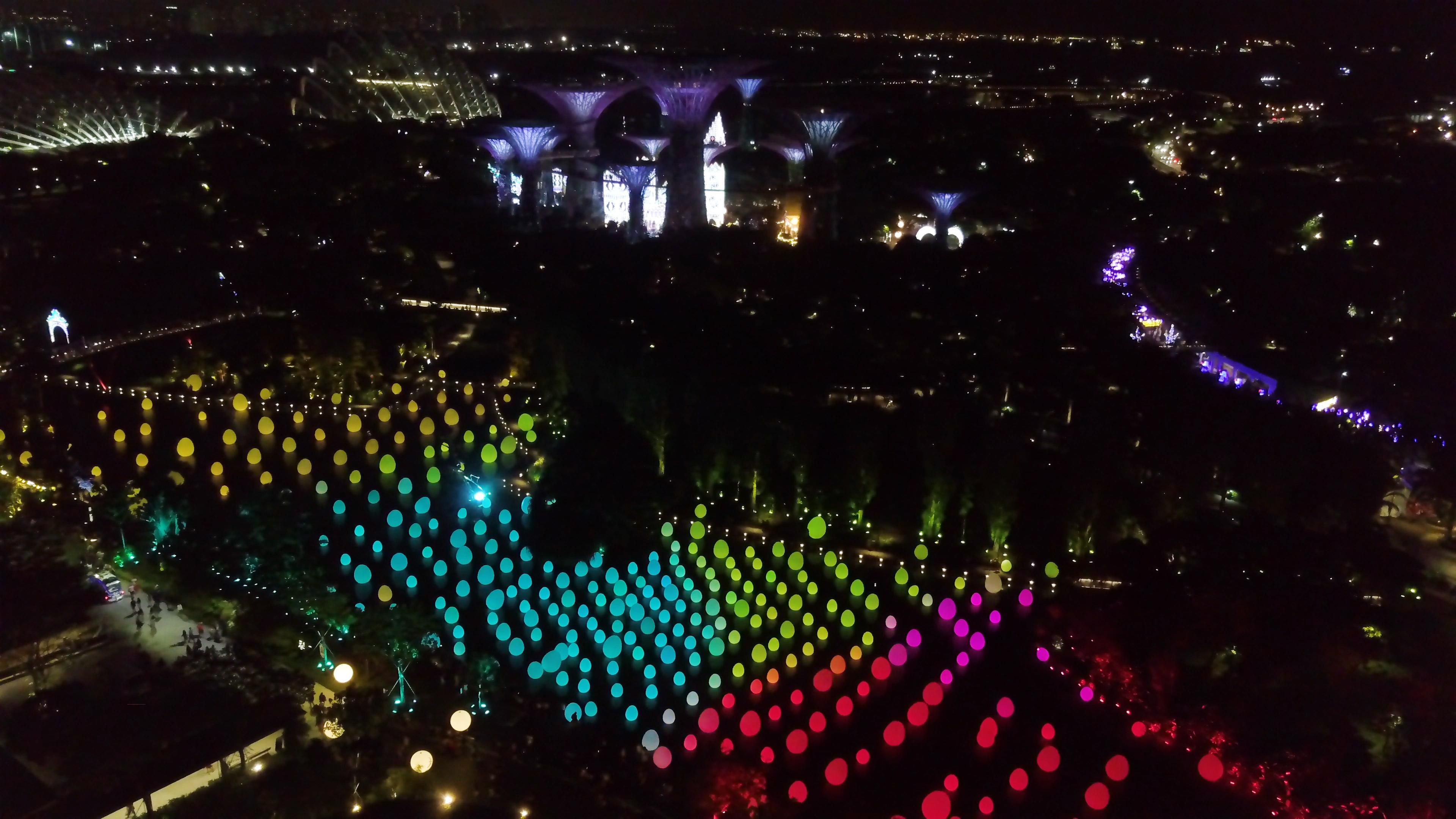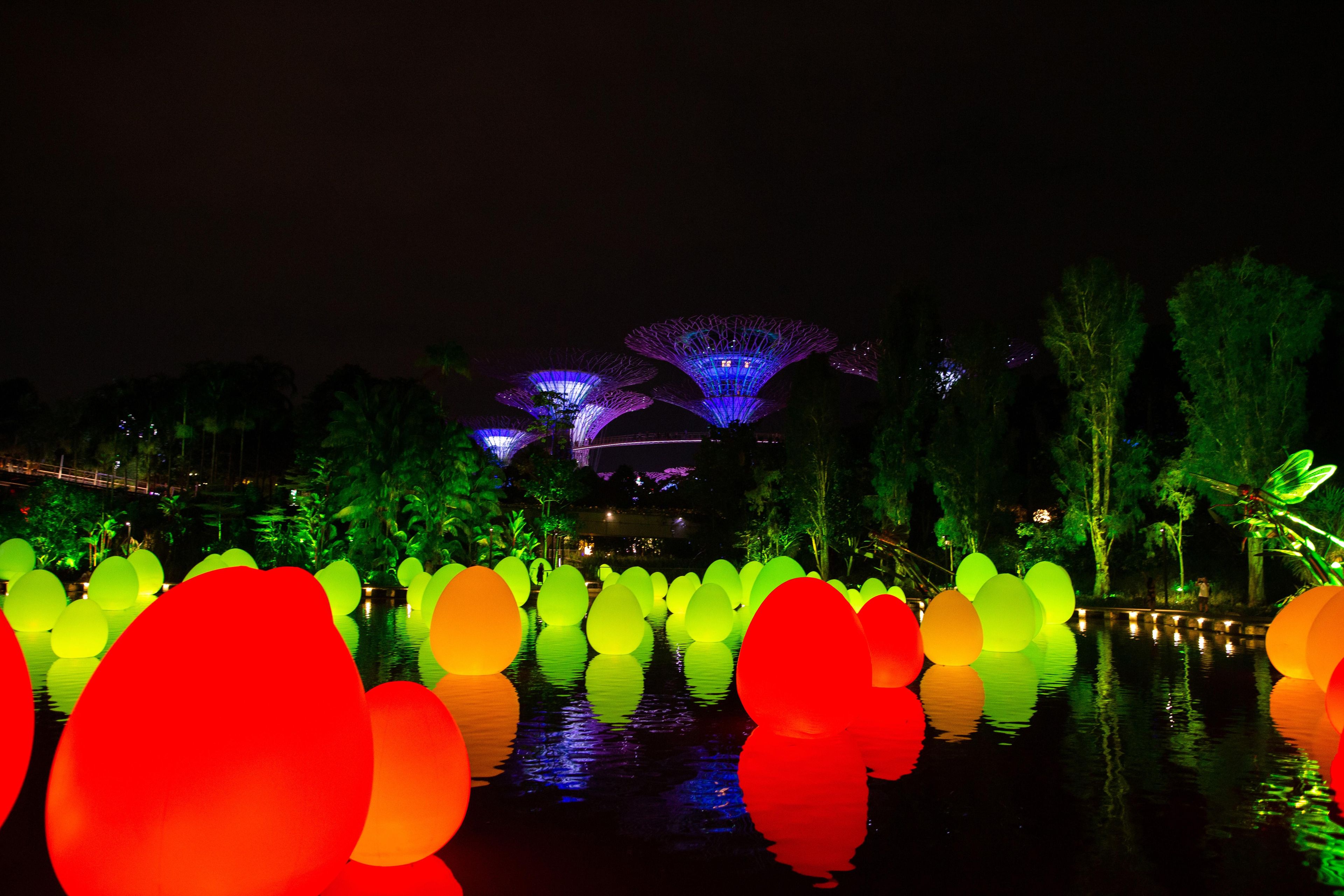 蛋狀物和樹木上的光都有著各自的律動,彷彿在慢慢呼吸一般,忽明忽暗。