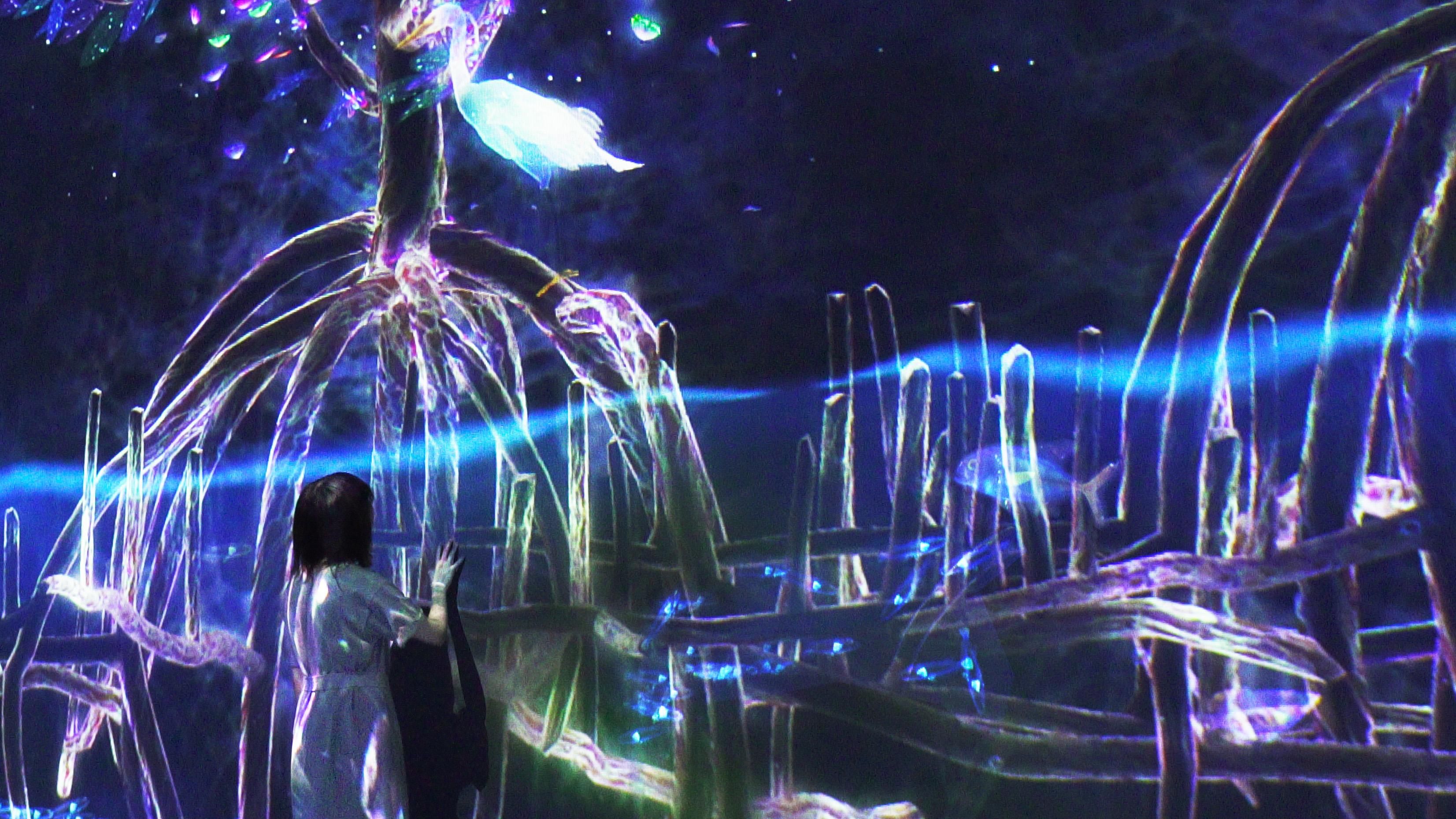 本作品始於實際尺寸大小的紅樹林世界,隨後變化成被擴大的紅樹林水中世界,以及平時無法用肉眼看到的微生物世界,使來場者產生自己被縮小的幻覺。
