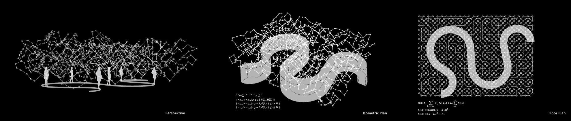 空間中看似隨機配置的燈具,其實是經由數學公式所導出的。無論從哪一盞燈具開始,持續向最接近的燈具延伸時,便會形成一條連接所有燈具、並只通過每盞燈具一次,如同“一筆畫”(unicursal)般的光之軌跡。