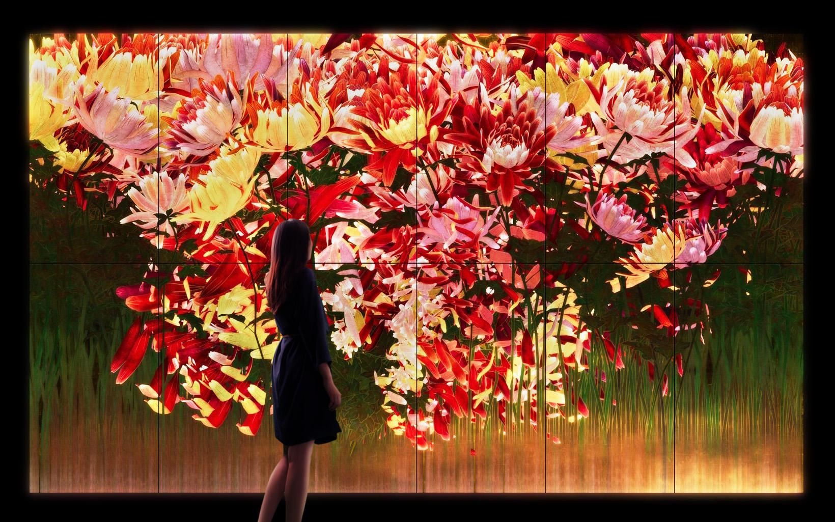 The space of the artwork is created with what teamLab refers to as Ultrasubjective Space. In contrast to spaces that are created through, or in other words cut out by, lenses and perspective, Ultrasubjective Space does not fix the viewer’s viewpoint and in turn frees the body. The wall that the flowers are seen on does not become a boundary between the viewer and the artwork, and the artwork space is continuous with the space of the viewer’s body.