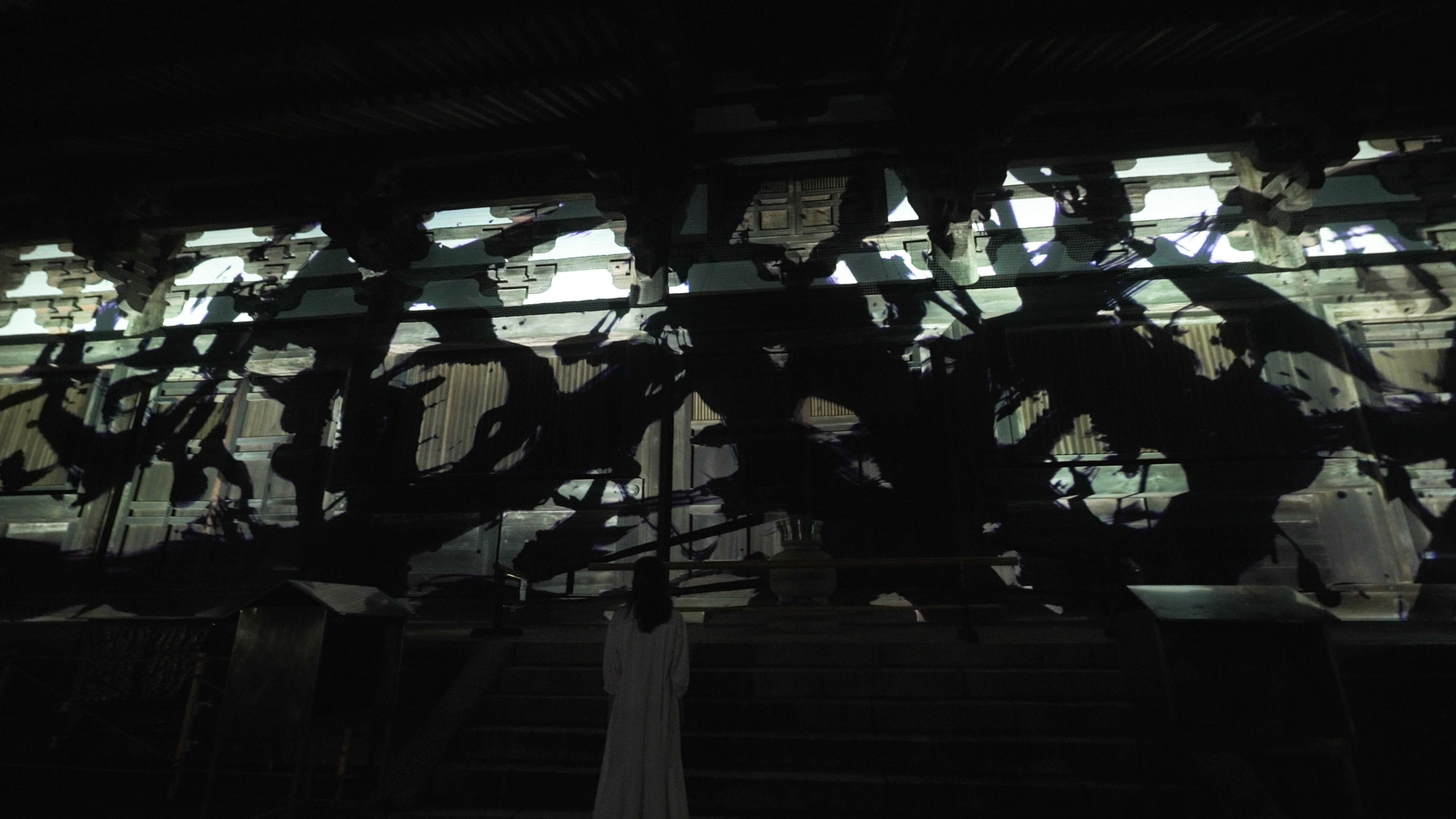 Spatial Calligraphy is calligraphy drawn in space, a form of calligraphy that teamLab has been exploring since it was founded. The artwork reconstructs calligraphy in three dimensional space to express the depth, speed and power of the brush stroke, and that calligraphy is then flattened using the logical structure teamLab calls ultrasubjective space. The calligraphy shifts between two and three dimensions.