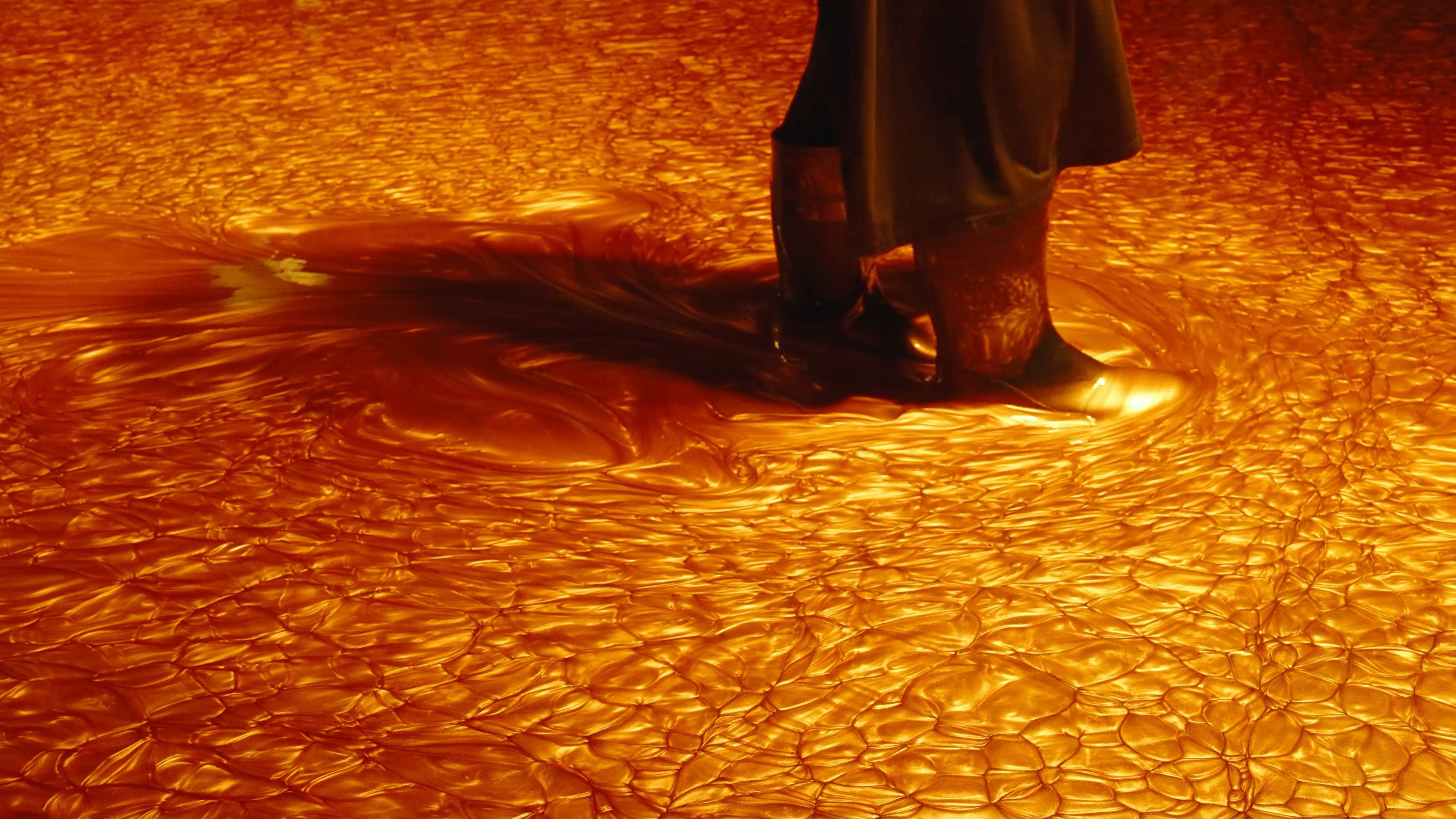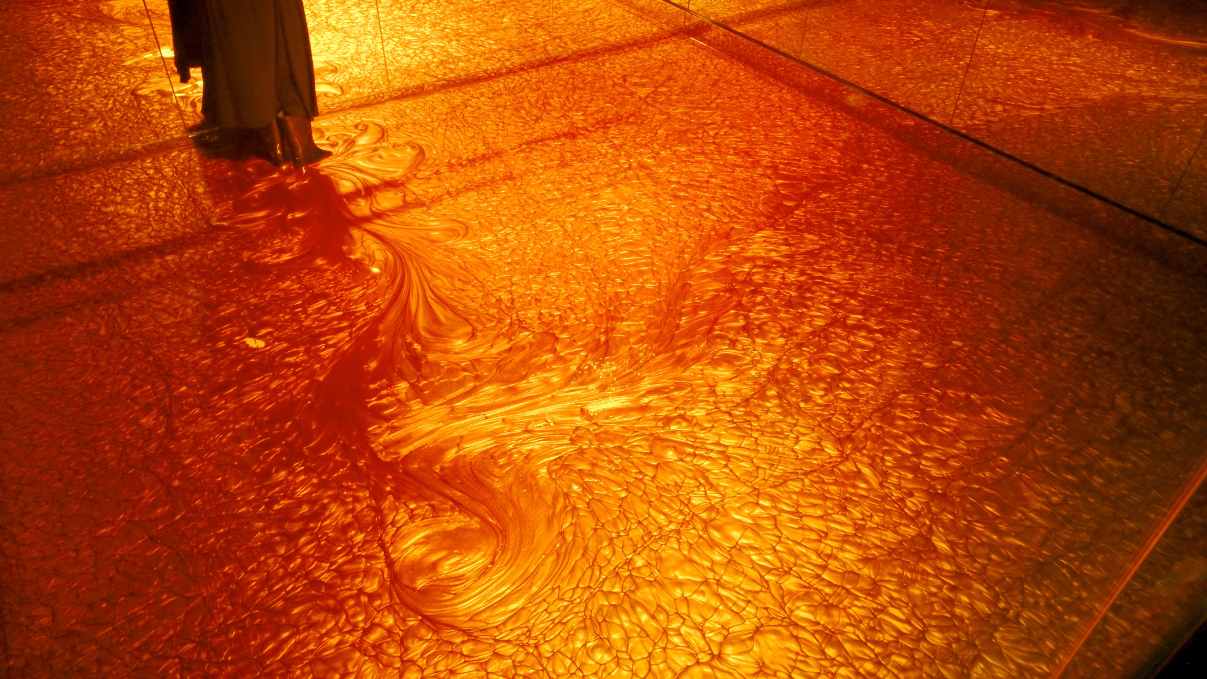 People cause the countless cell-like existences to be destroyed, and an abstract painting of trajectories and vortices is created.