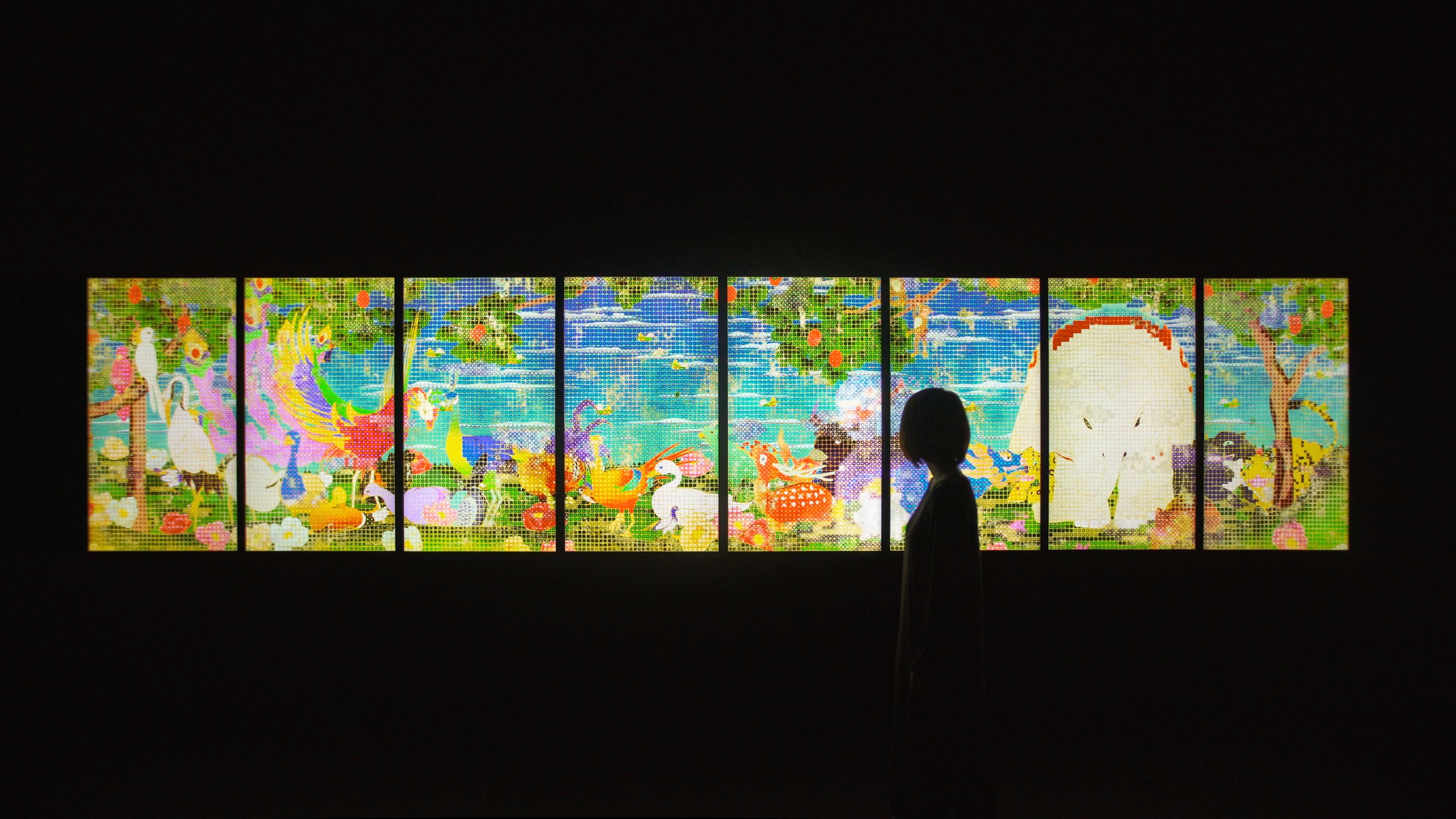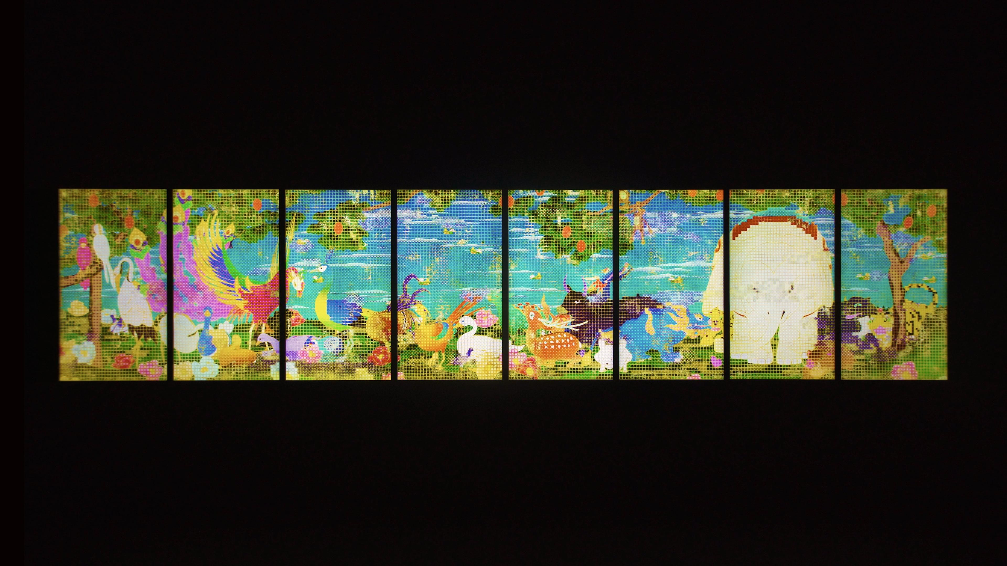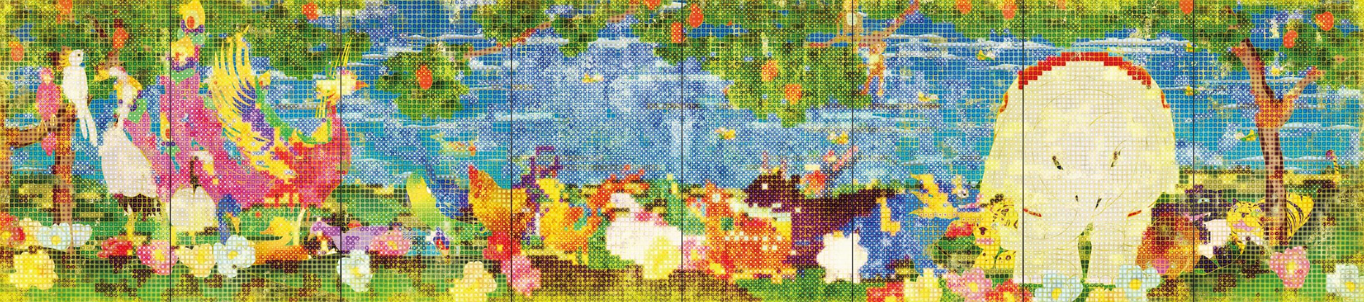 伊藤若沖(Jakuchu Ito,1716-1800)是日本早期現代畫家,江戶中期活躍於京都。他的繪畫風格獨特,作品表面由成千上萬個色彩各異的方塊組成。 《涅槃》(Nirvana)的創作靈感源於屏畫《鳥》、《動物》、《開花植物和樹》、《花》以及《鳥和動物》。