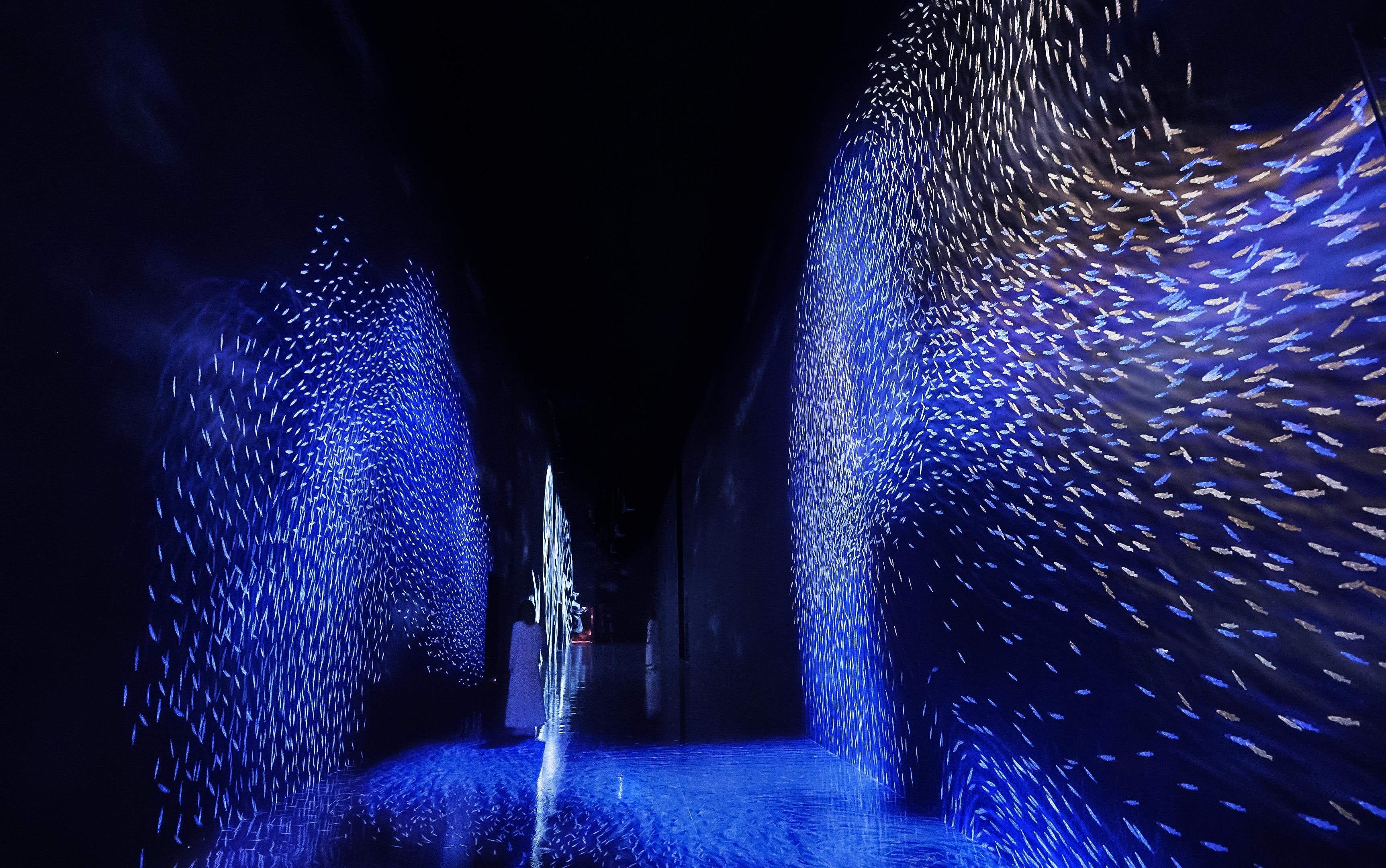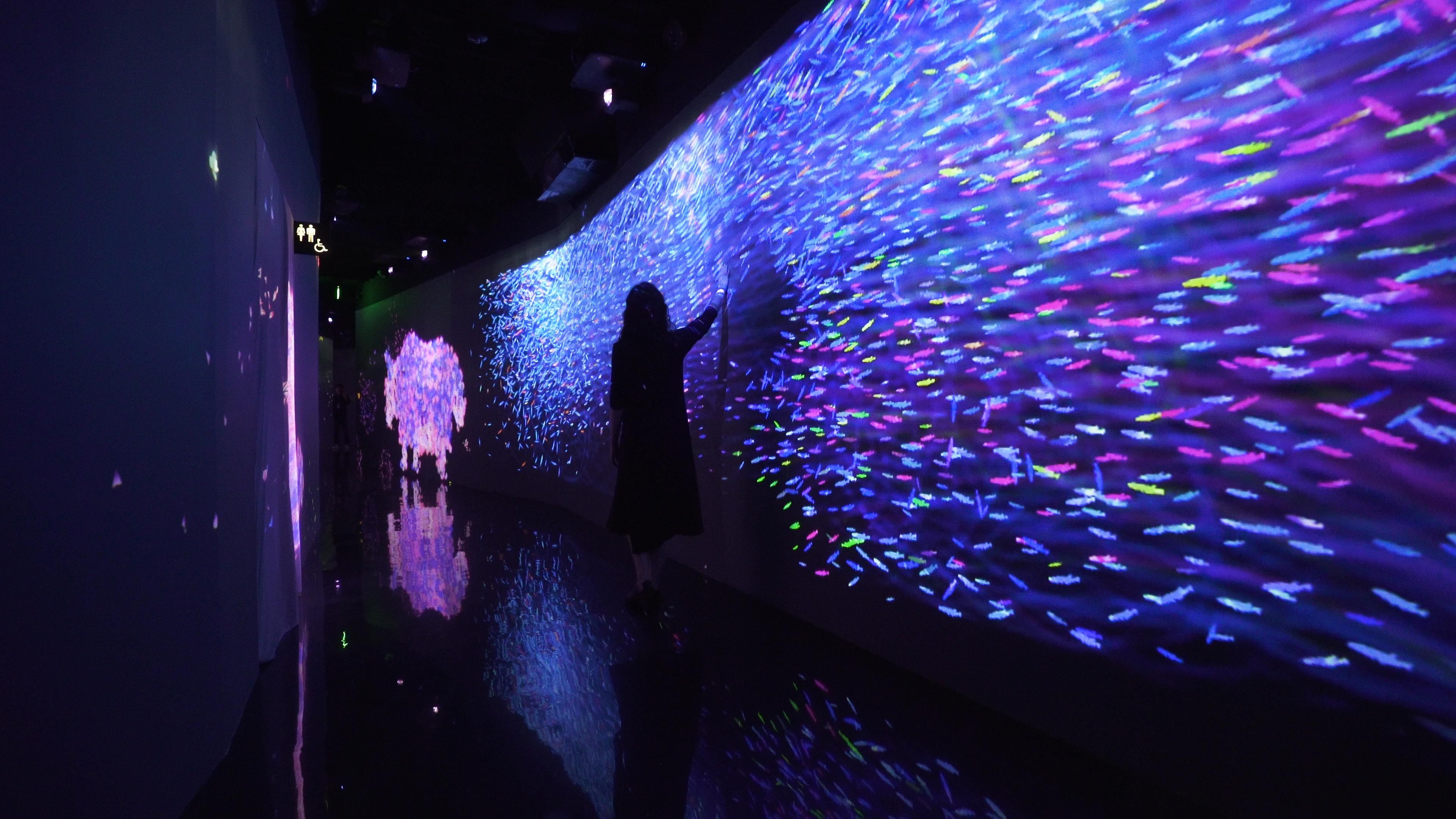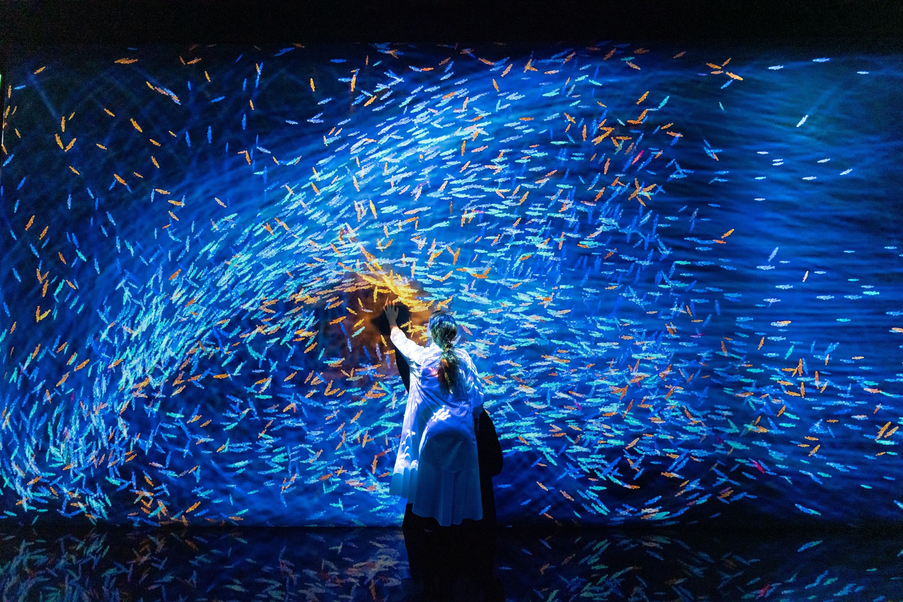 當人們觸碰魚群時,魚群便會染上人們自身帶有的各種各樣的色彩。