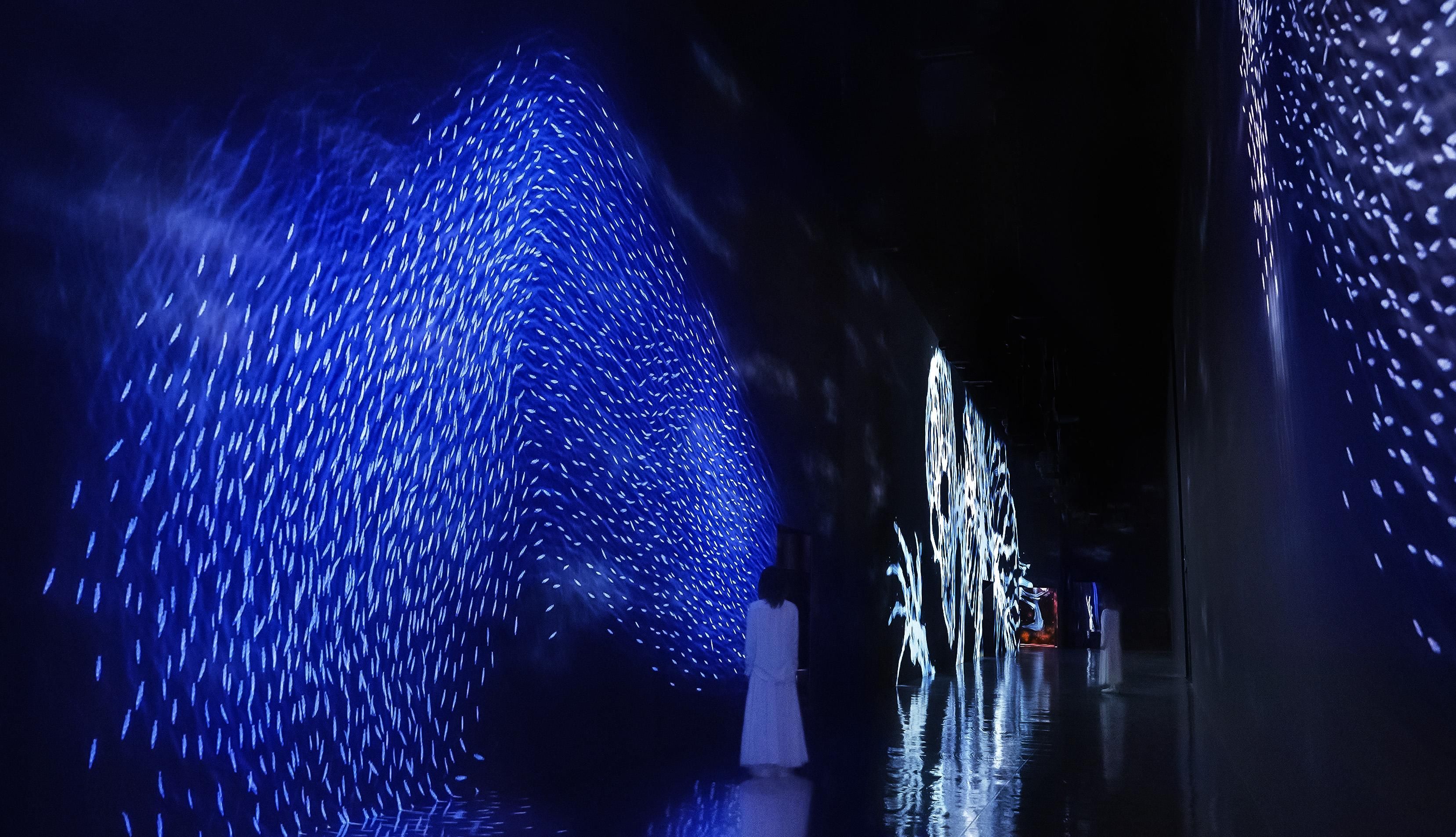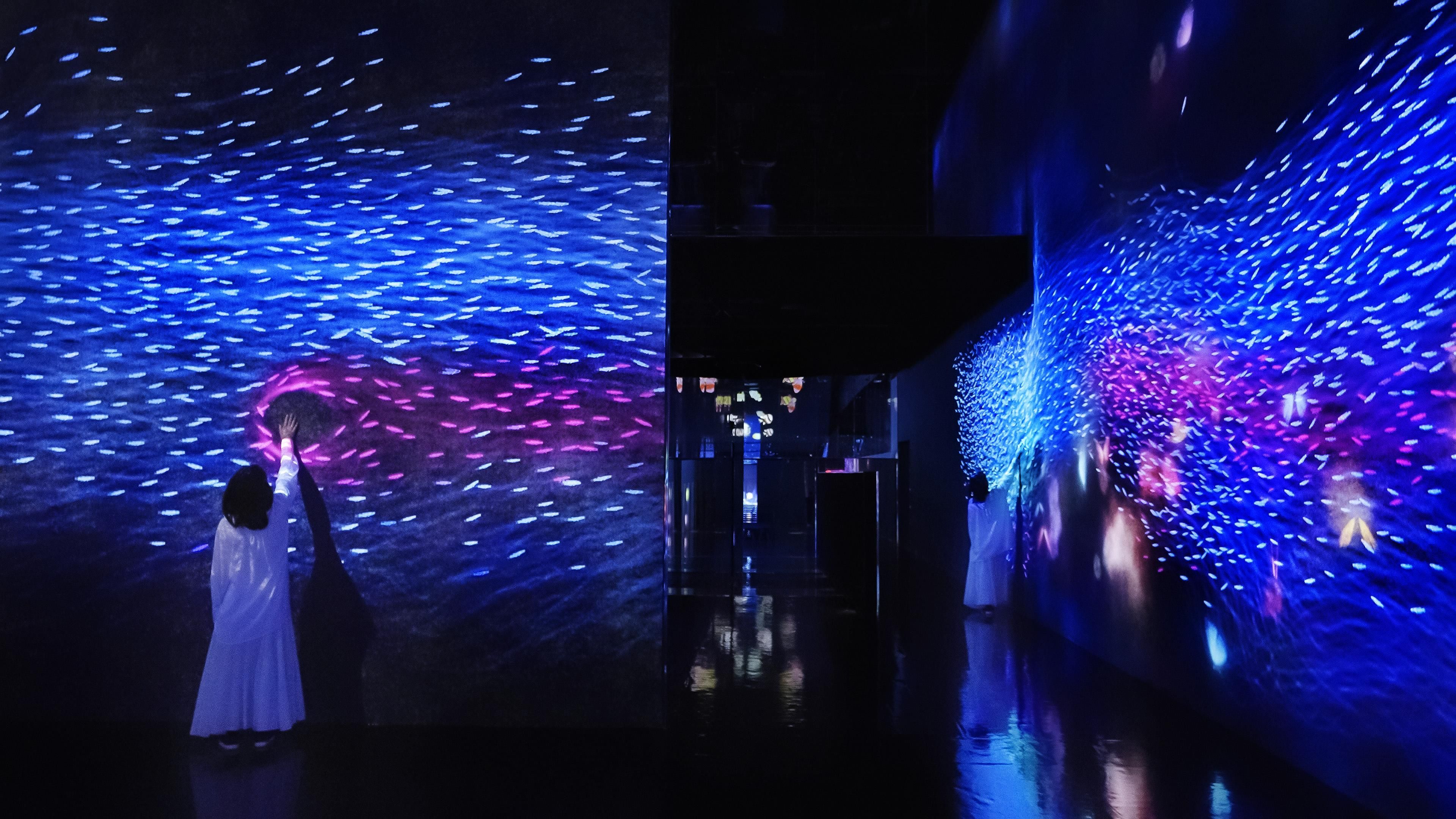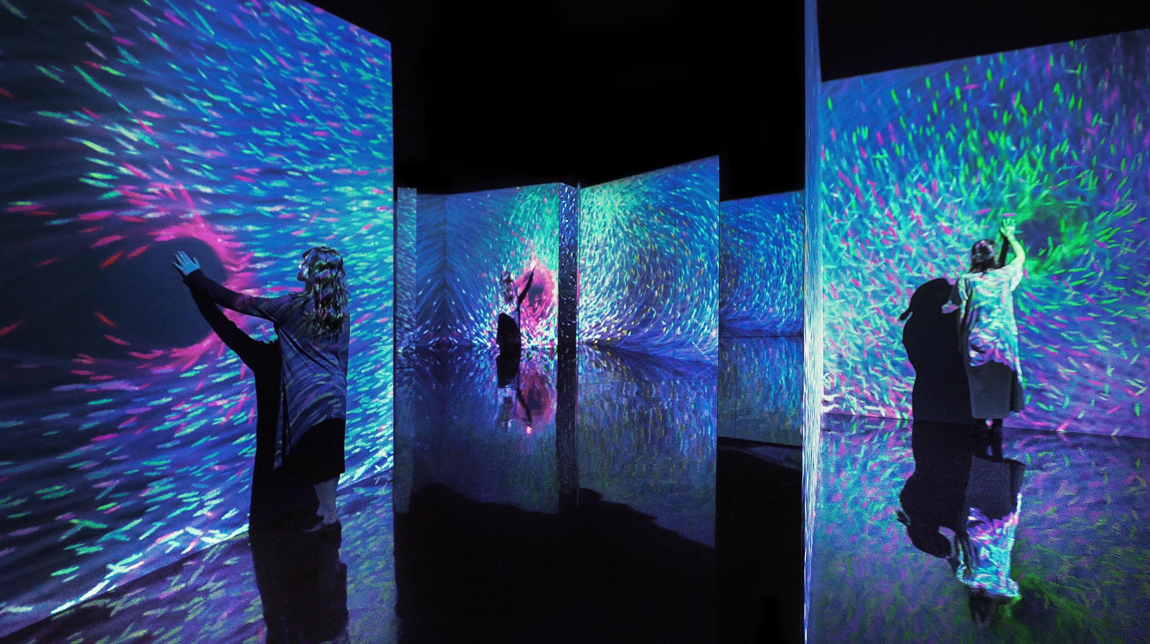 當人們觸碰魚群時,魚群便會染上人們自身帶有的各種各樣的色彩。